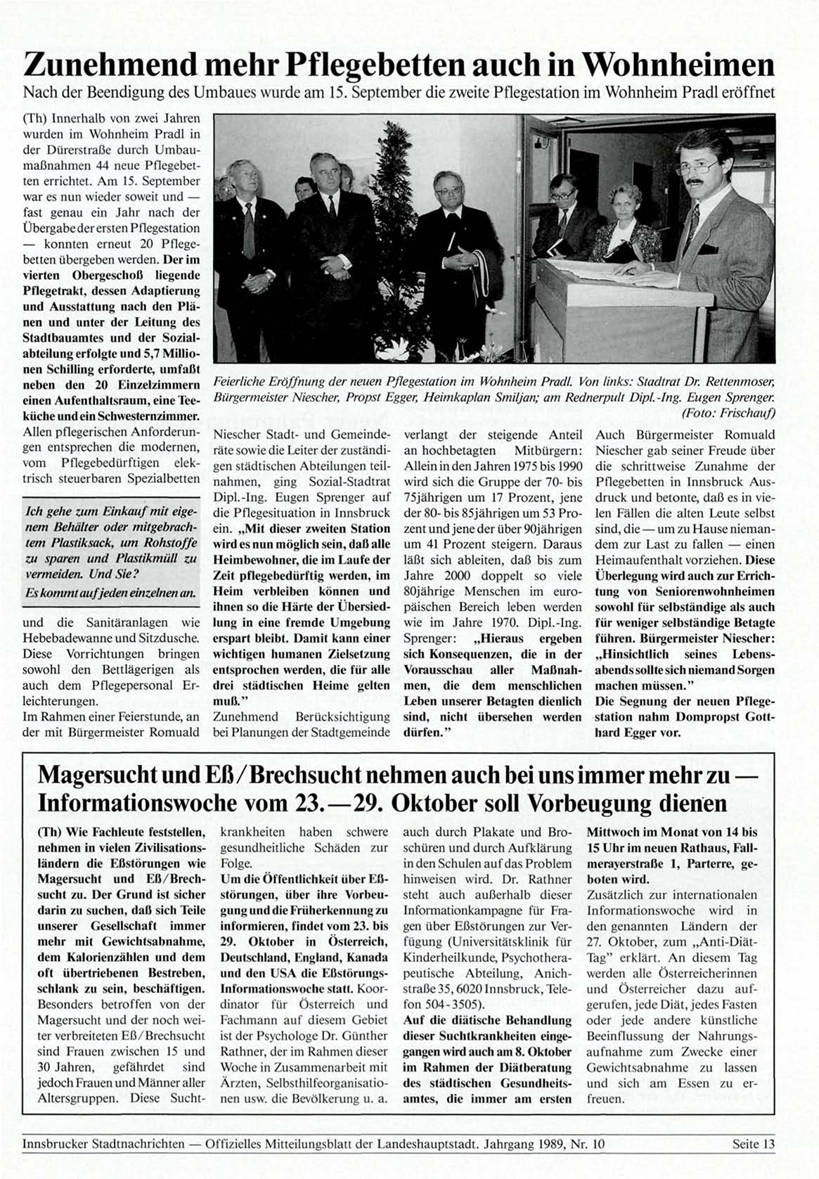 Innsbrucker Stadtnachrichten — Offizielles Mitteilungsblatt der Landeshauptstadt. Jahrgang 1989, Nr. 10