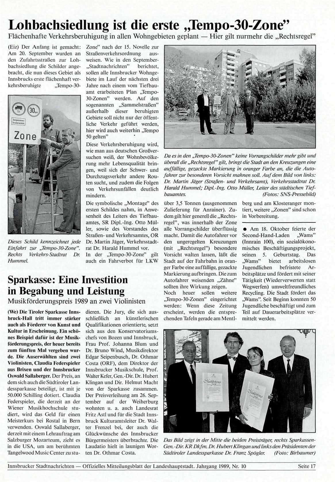 Innsbrucker Stadtnachrichten — Offizielles Mitteilungsblatt der Landeshauptstadt. Jahrgang 1989, Nr. 10