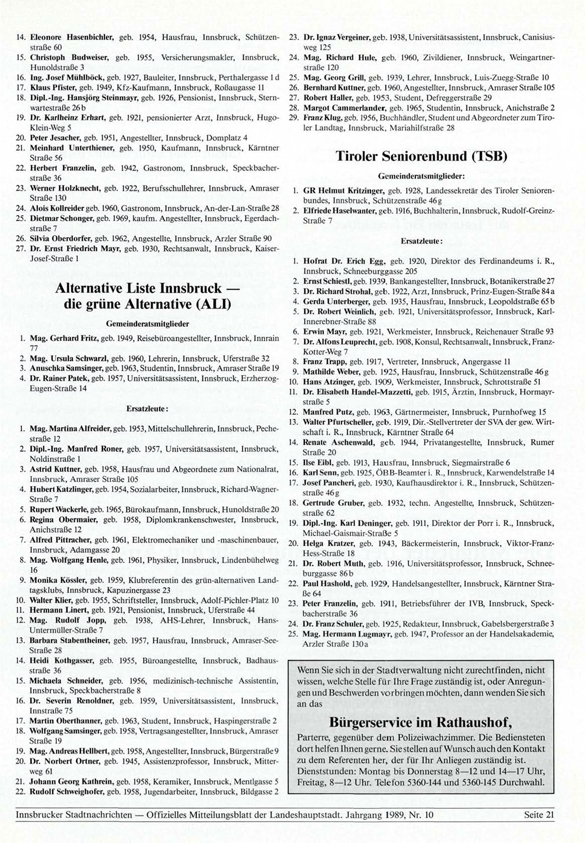 Innsbrucker Stadtnachrichten — Offizielles Mitteilungsblatt der Landeshauptstadt. Jahrgang 1989, Nr. 10