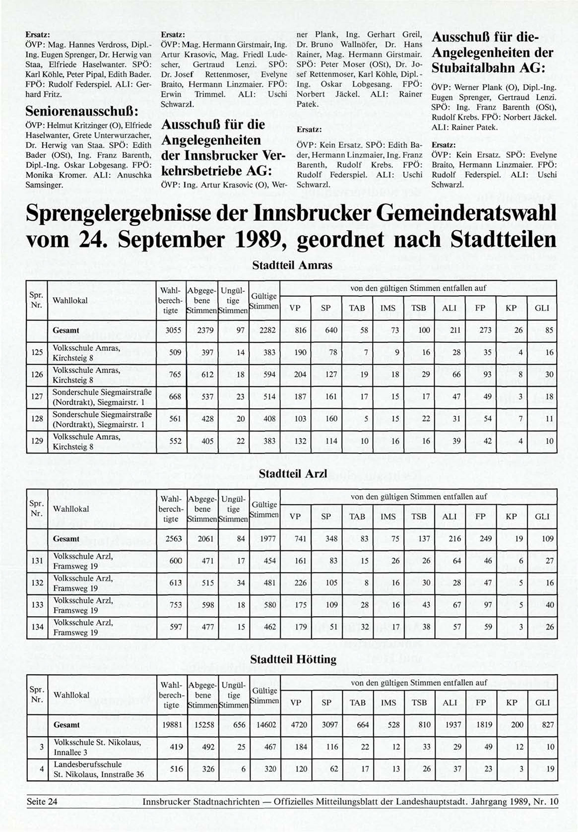 Innsbrucker Stadtnachrichten — Offizielles Mitteilungsblatt der Landeshauptstadt. Jahrgang 1989, Nr. 10