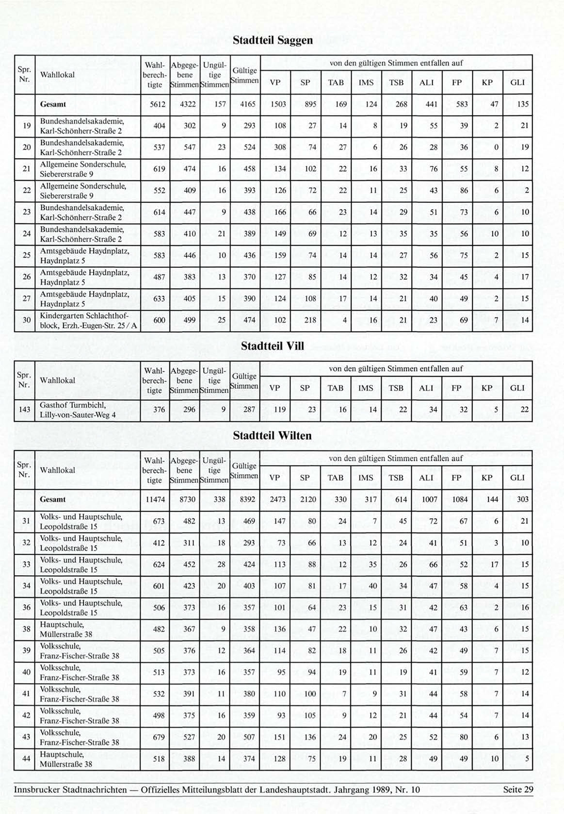 Innsbrucker Stadtnachrichten — Offizielles Mitteilungsblatt der Landeshauptstadt. Jahrgang 1989, Nr. 10