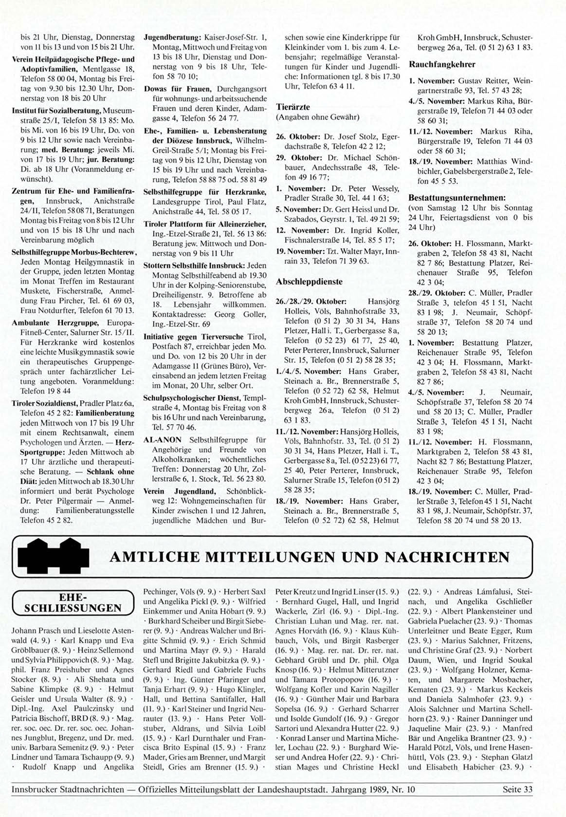 Innsbrucker Stadtnachrichten — Offizielles Mitteilungsblatt der Landeshauptstadt. Jahrgang 1989, Nr. 10