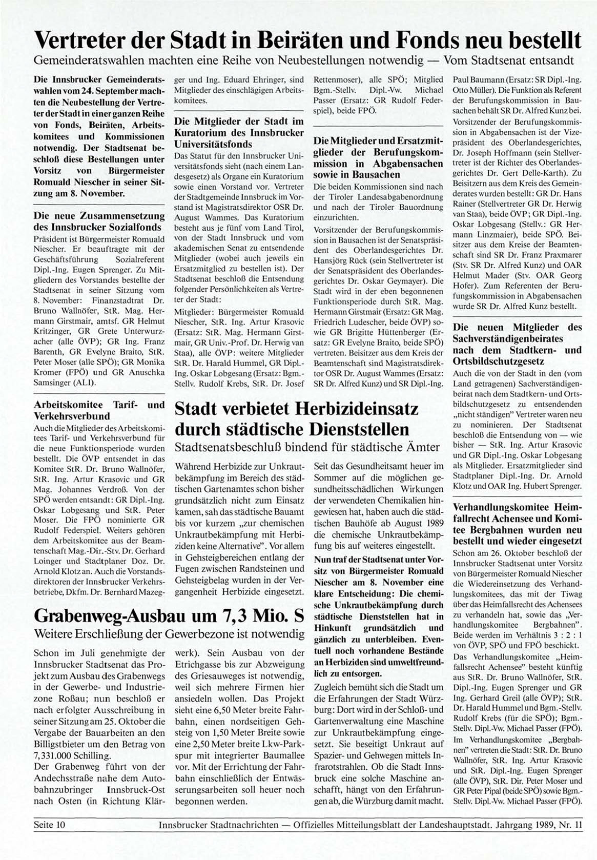 Innsbrucker Stadtnachrichten — Offizielles Mitteilungsblatt der Landeshauptstadt. Jahrgang 1989, Nr. 11