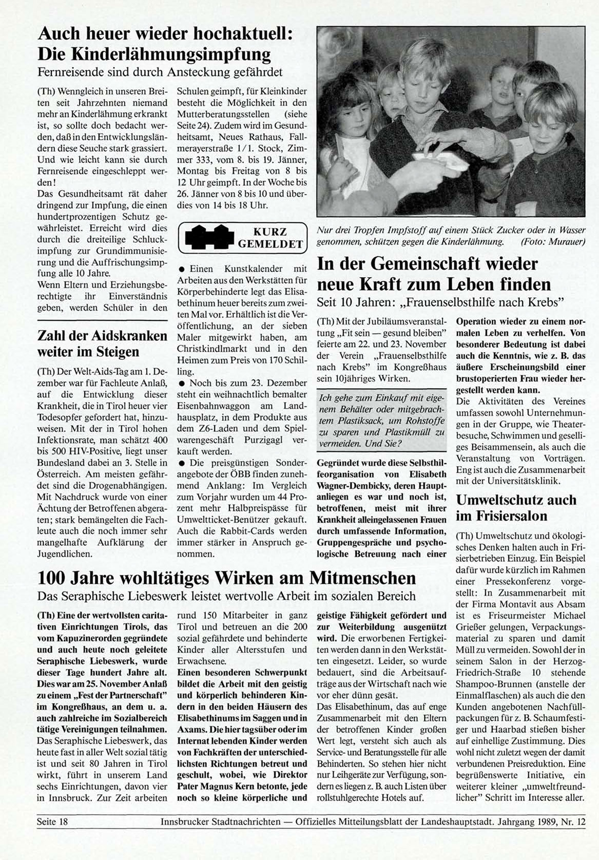 Innsbrucker Stadtnachrichten — Offizielles Mitteilungsblatt der Landeshauptstadt. Jahrgang 1989, Nr. 12