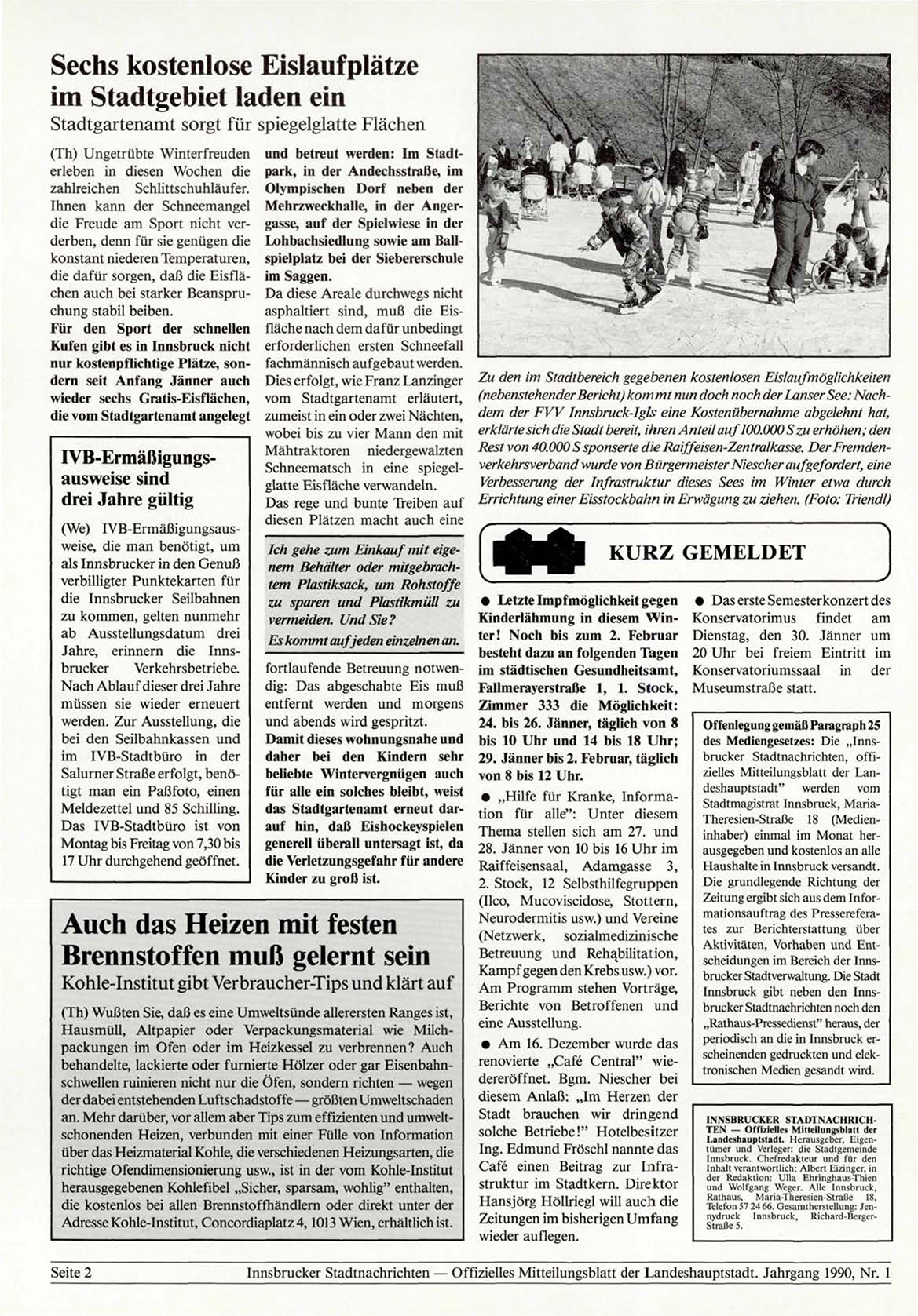Innsbrucker Stadtnachrichten — Offizielles Mitteilungsblatt der Landeshauptstadt. Jahrgang 1990, Nr. 1