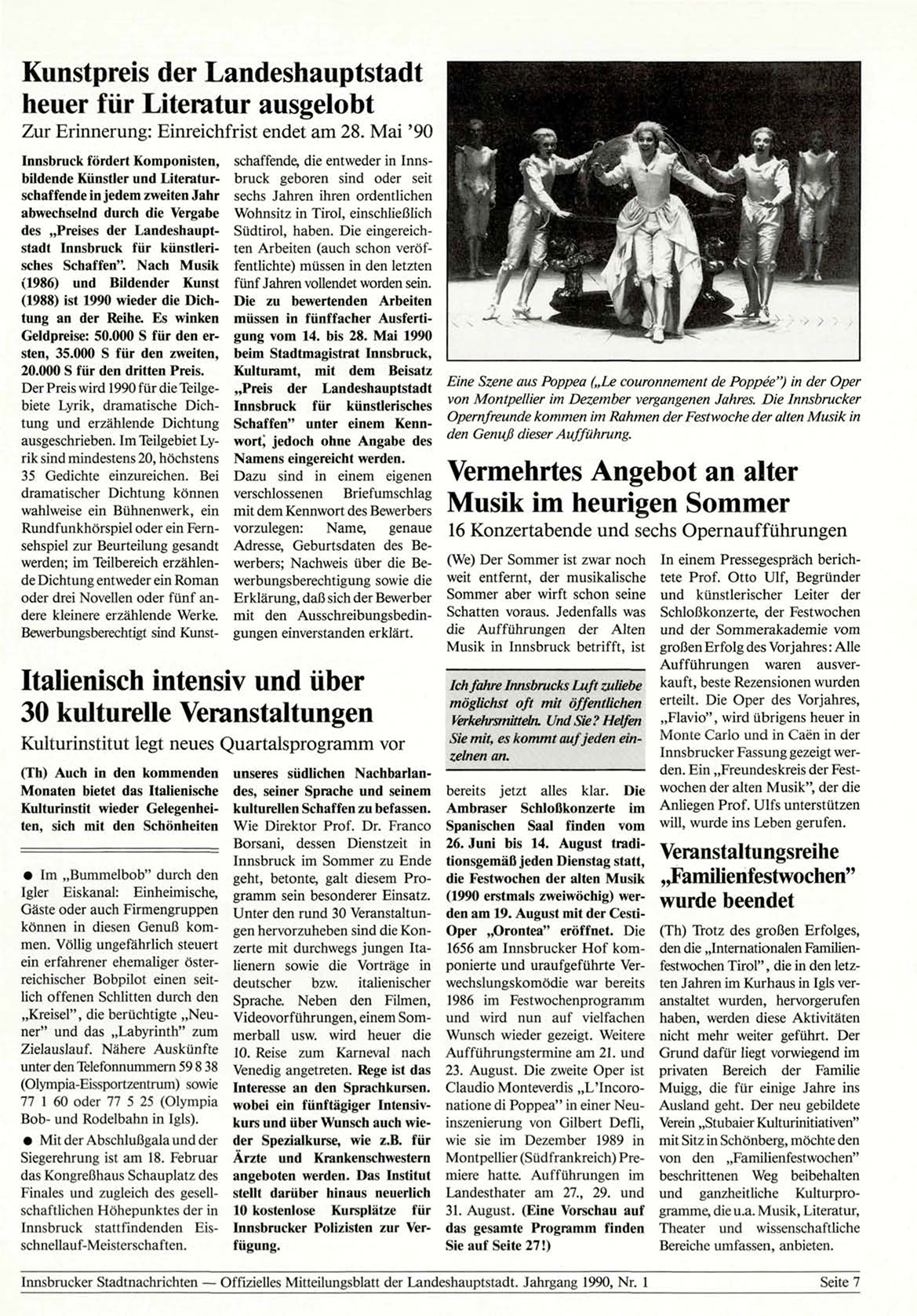 Innsbrucker Stadtnachrichten — Offizielles Mitteilungsblatt der Landeshauptstadt. Jahrgang 1990, Nr. 1