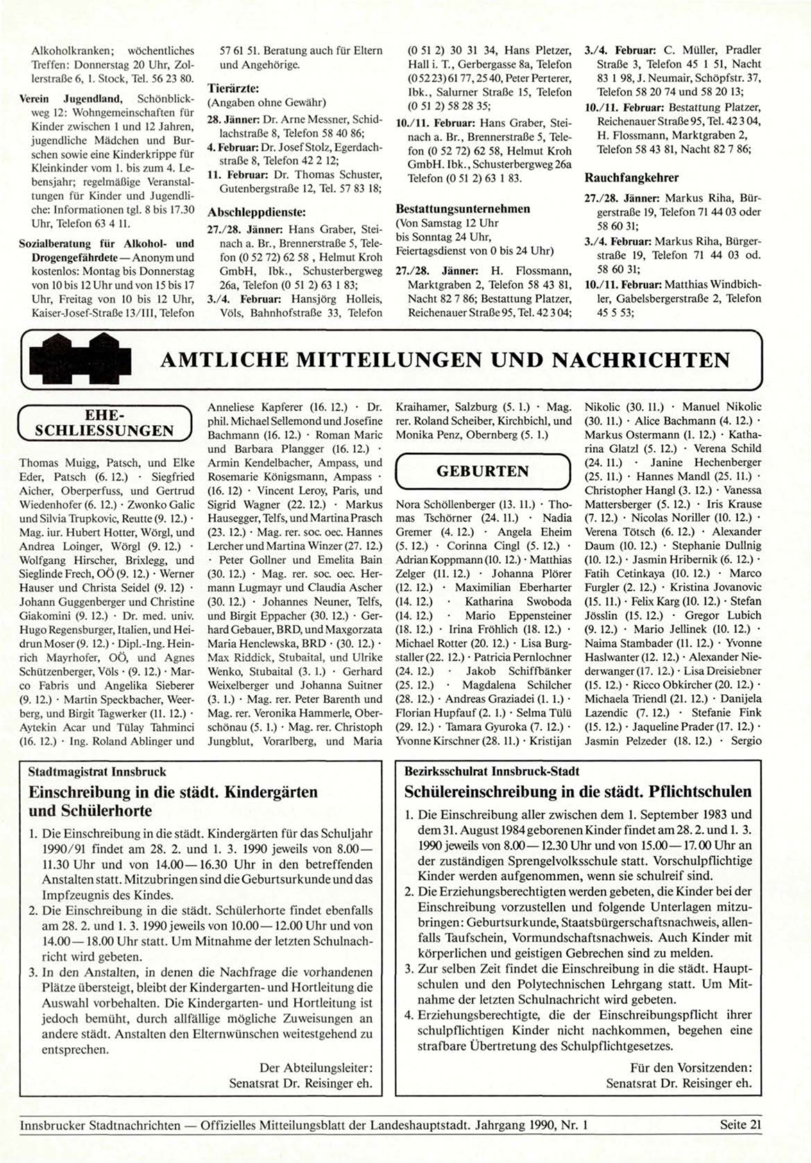 Innsbrucker Stadtnachrichten — Offizielles Mitteilungsblatt der Landeshauptstadt. Jahrgang 1990, Nr. 1