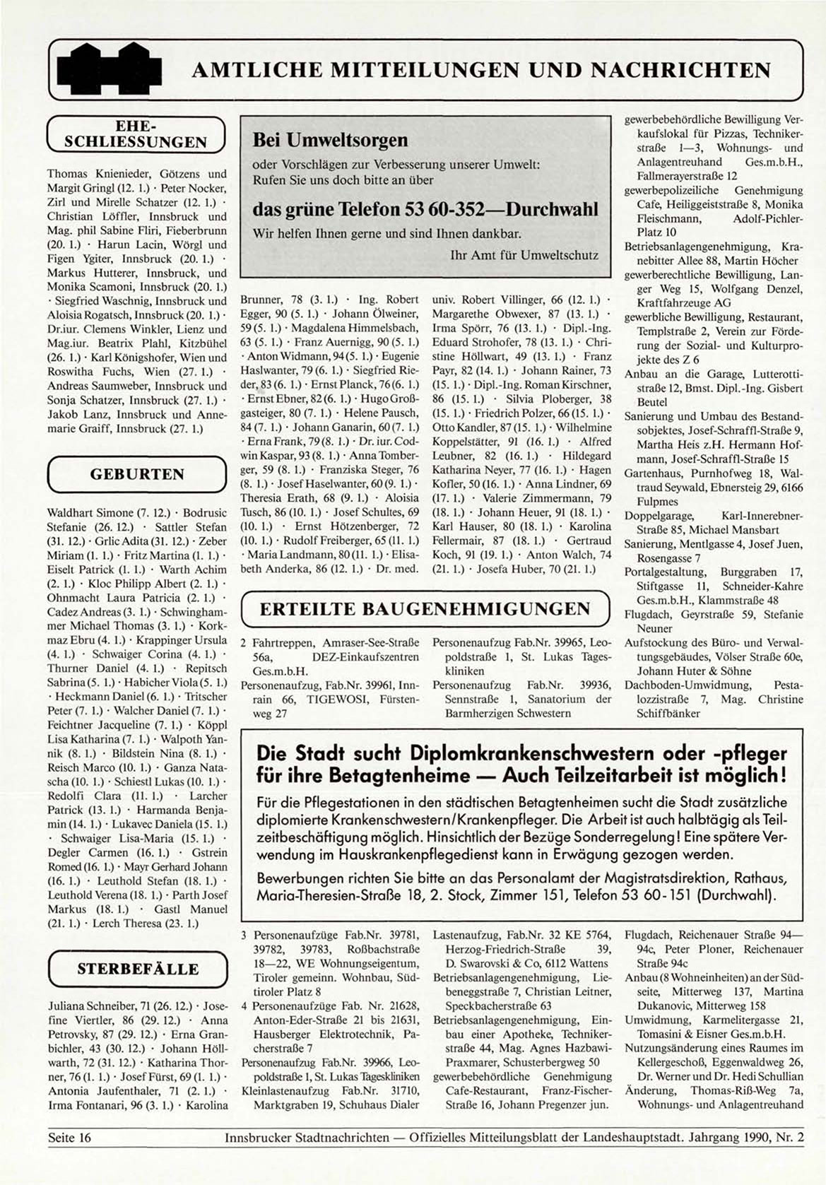 Innsbrucker Stadtnachrichten — Offizielles Mitteilungsblatt der Landeshauptstadt. Jahrgang 1990, Nr. 2