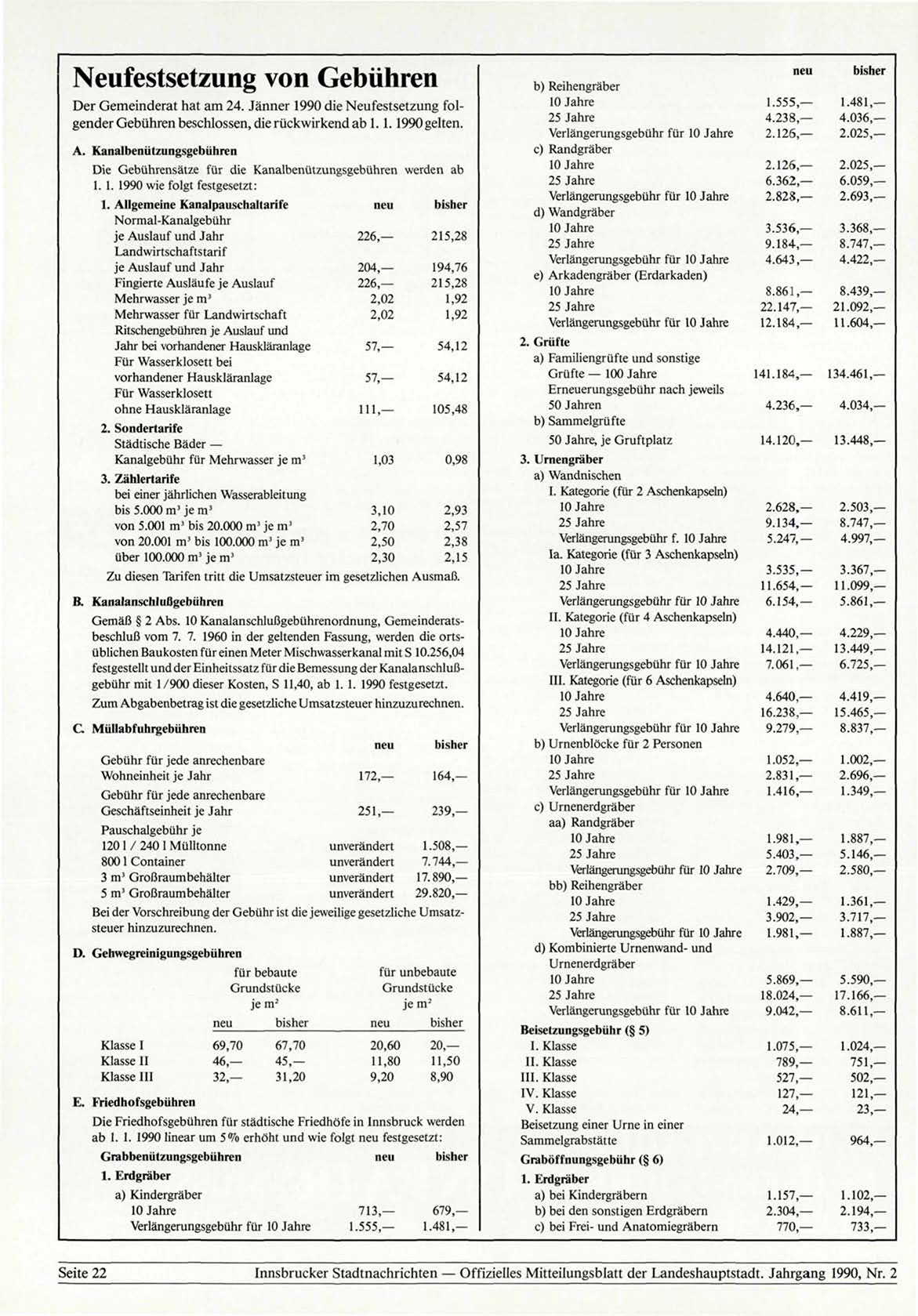 Der Gemeinderat hat am 24. Jänner 1990 die Neufestsetzung folgender Gebühren beschlossen, die rückwirkend ab 1.1.1990 gelten.