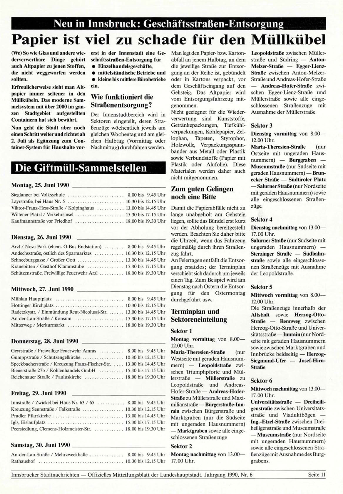 Innsbrucker Stadtnachrichten — Offizielles Mitteilungsblatt der Landeshauptstadt. Jahrgang 1990, Nr. 6
