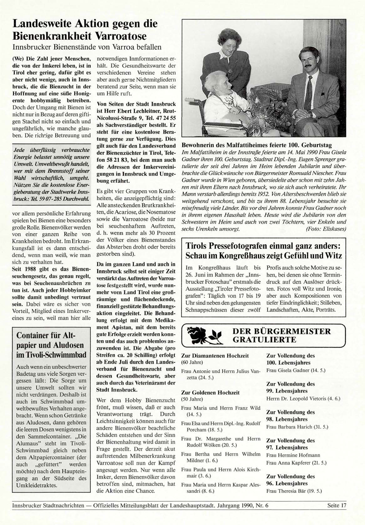 Innsbrucker Stadtnachrichten — Offizielles Mitteilungsblatt der Landeshauptstadt. Jahrgang 1990, Nr. 6