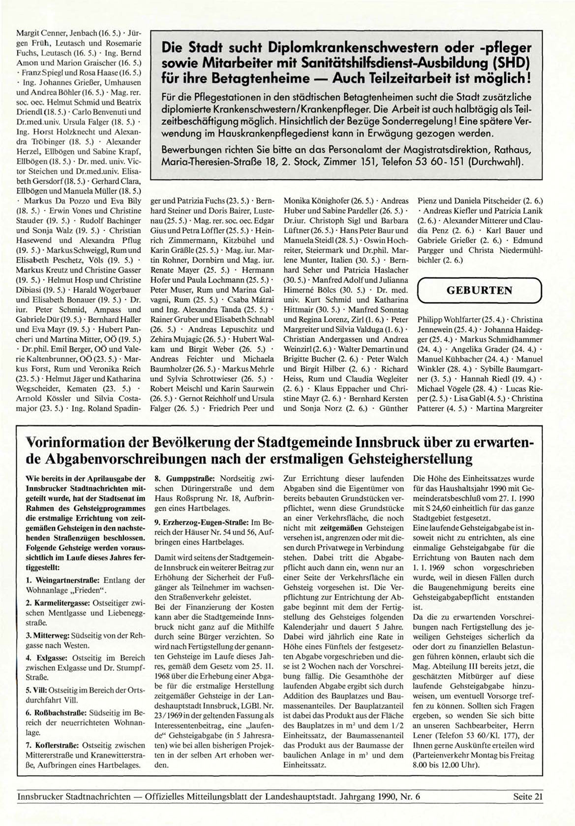 Innsbrucker Stadtnachrichten — Offizielles Mitteilungsblatt der Landeshauptstadt. Jahrgang 1990, Nr. 6