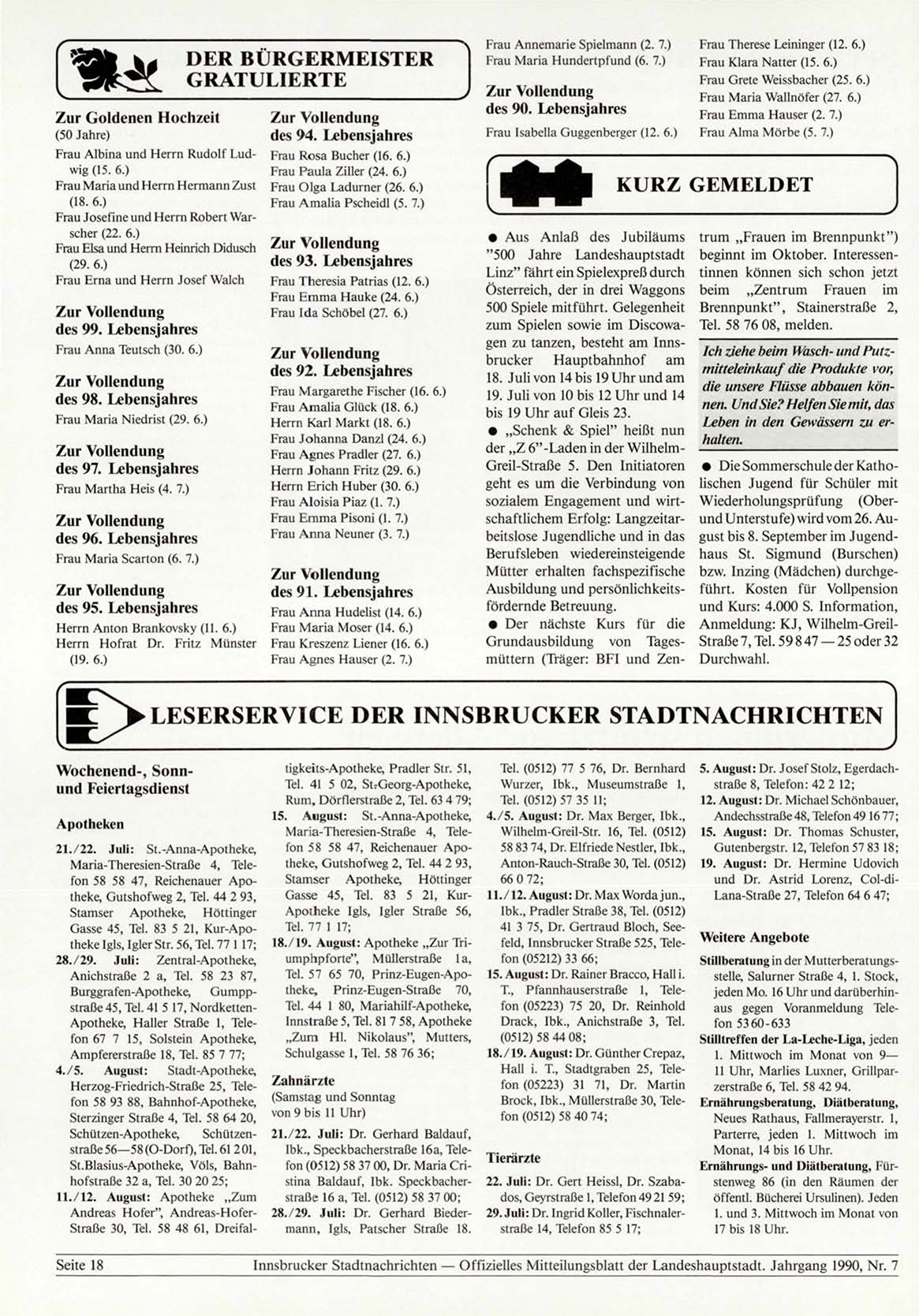 Innsbrucker Stadtnachrichten — Offizielles Mitteilungsblatt der Landeshauptstadt. Jahrgang 1990, Nr. 7