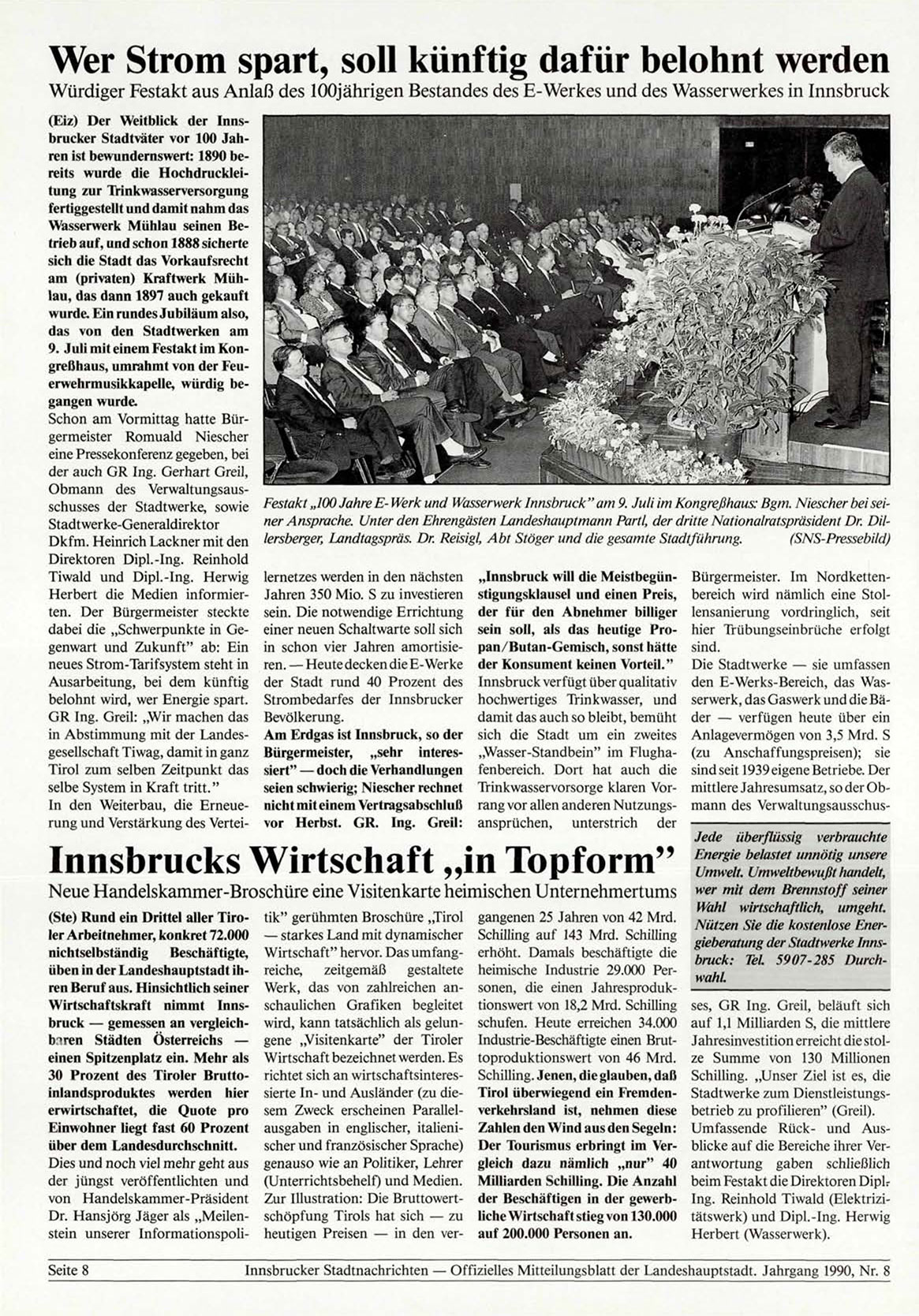 Innsbrucker Stadtnachrichten — Offizielles Mitteilungsblatt der Landeshauptstadt. Jahrgang 1990, Nr. 8