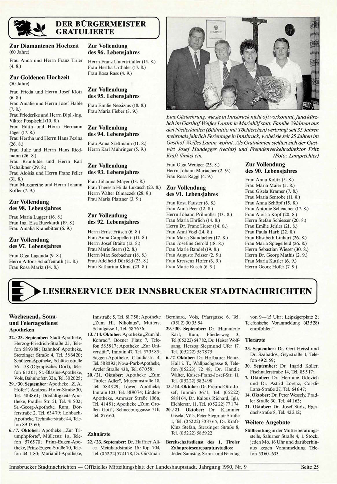 Innsbrucker Stadtnachrichten — Offizielles Mitteilungsblatt der Landeshauptstadt. Jahrgang 1990, Nr. 9