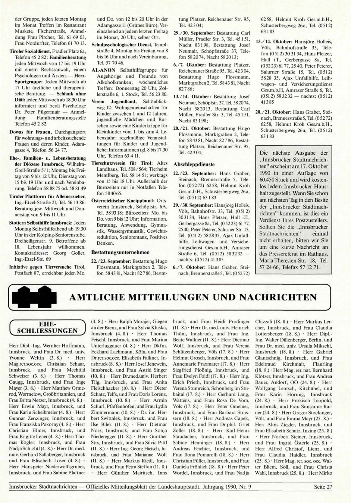 Innsbrucker Stadtnachrichten — Offizielles Mitteilungsblatt der Landeshauptstadt. Jahrgang 1990, Nr. 9