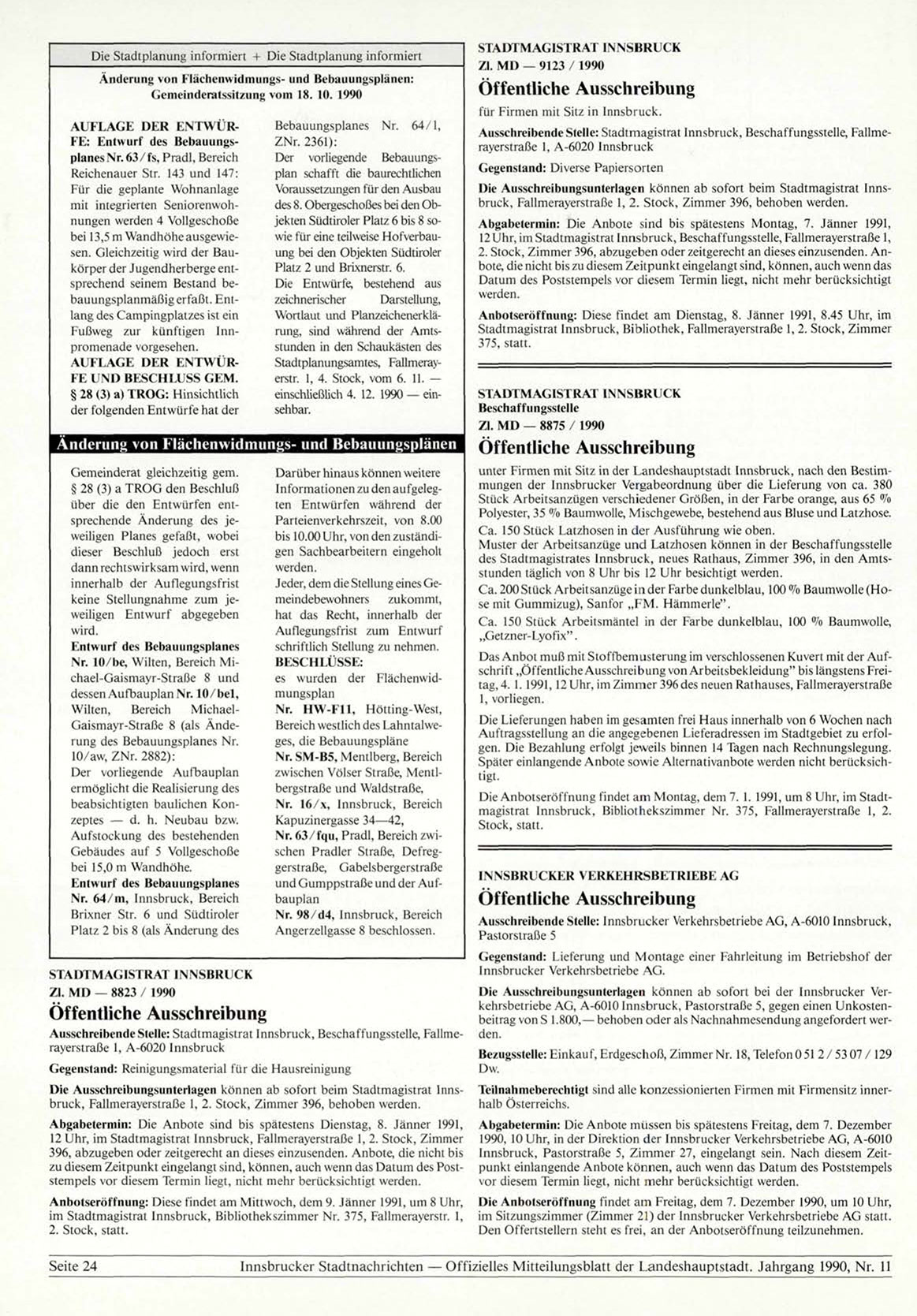 Die Anbotseröffnung findet am Montag, dem 7. 1. 1991, um 8 Uhr, im Stadtmagistrat Innsbruck, Bibliothekszimmer Nr. 375, Fallmerayerstraße 1, 2.