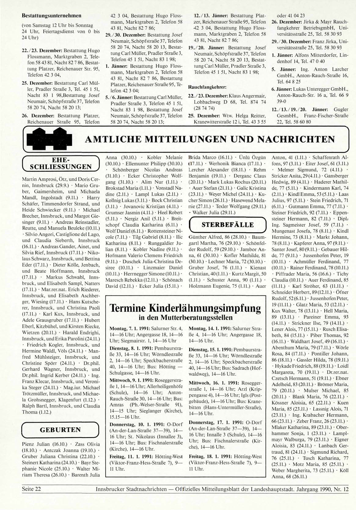 Innsbrucker Stadtnachrichten — Offizielles Mitteilungsblatt der Landeshauptstadt. Jahrgang 1990, Nr. 12