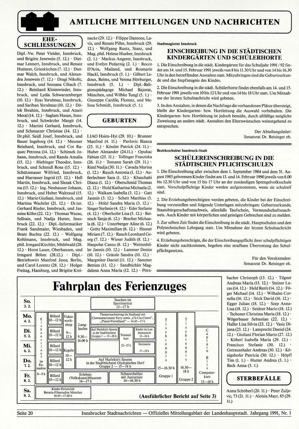 Innsbrucker Stadtnachrichten — Offizielles Mitteilungsblatt der Landeshauptstadt. Jahrgang 1991, Nr. 1