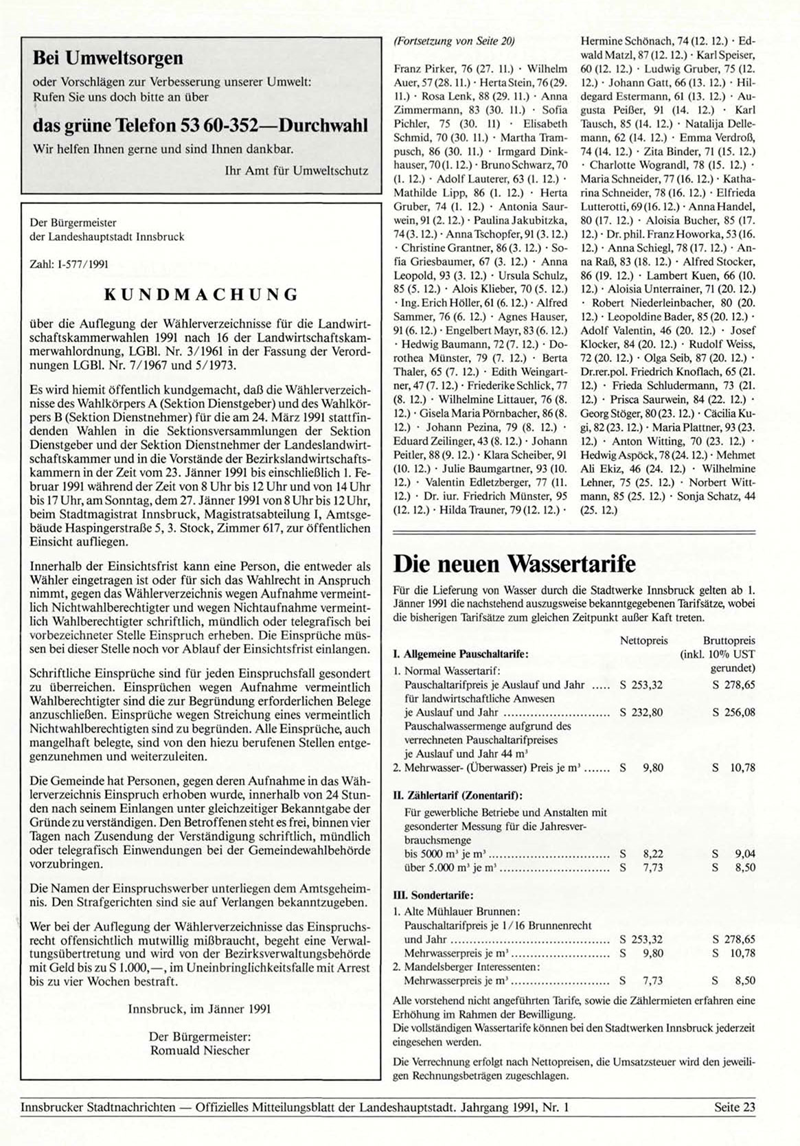 Innsbrucker Stadtnachrichten — Offizielles Mitteilungsblatt der Landeshauptstadt. Jahrgang 1991, Nr. 1