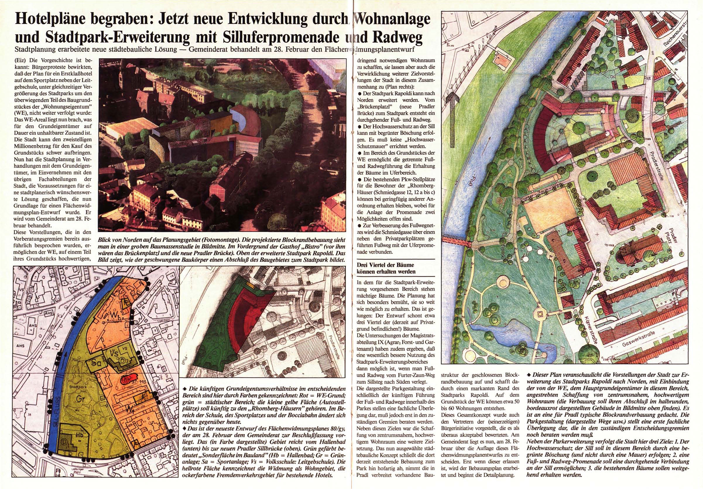 der am 28. Februar dem Gemeinderat zur Beschlußfassung vorliegt. Das (in Farbe dargestellte) Gebiet reicht vom Hallenbad