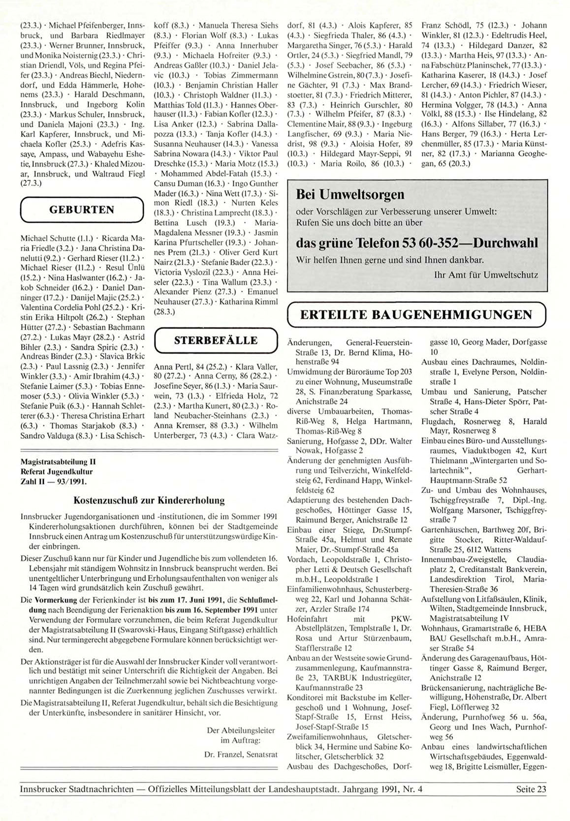 Innsbrucker Stadtnachrichten — Offizielles Mitteilungsblatt der Landeshauptstadt. Jahrgang 1991, Nr. 4
