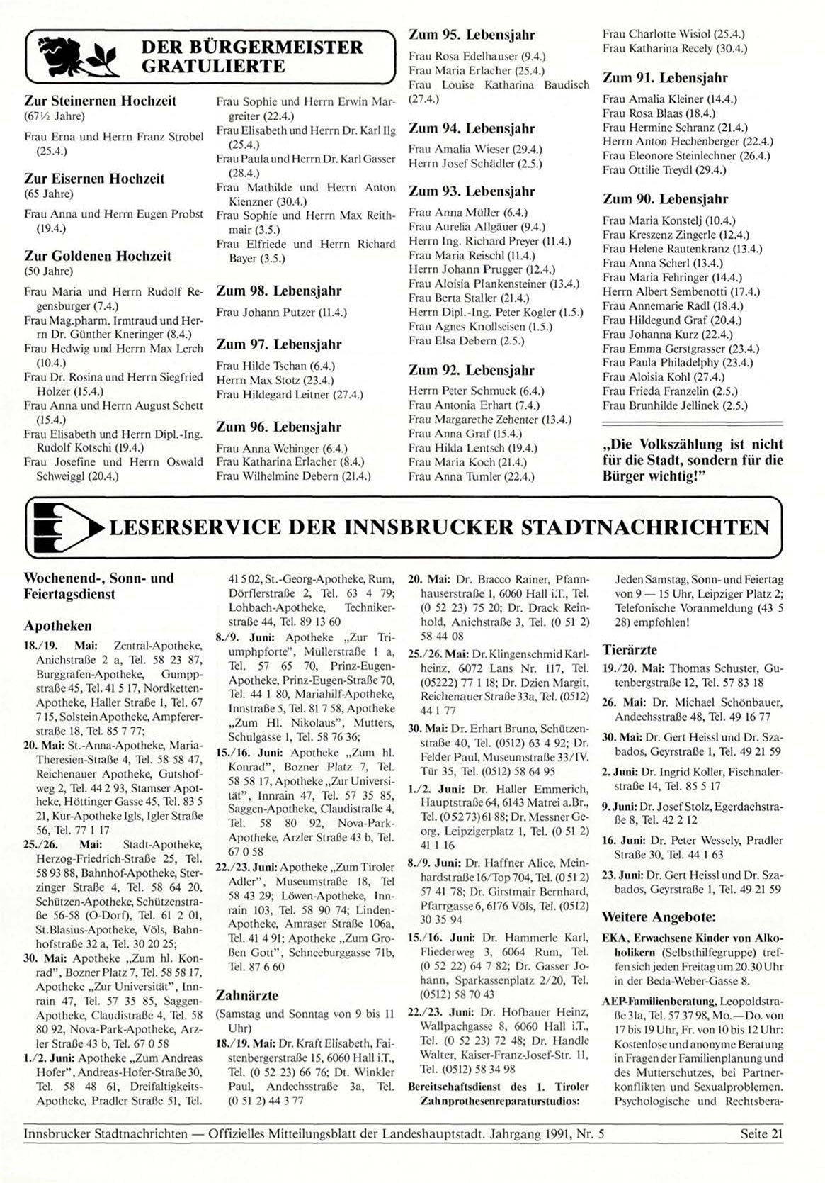 Innsbrucker Stadtnachrichten — Offizielles Mitteilungsblatt der Landeshauptstadt. Jahrgang 1991, Nr. 5