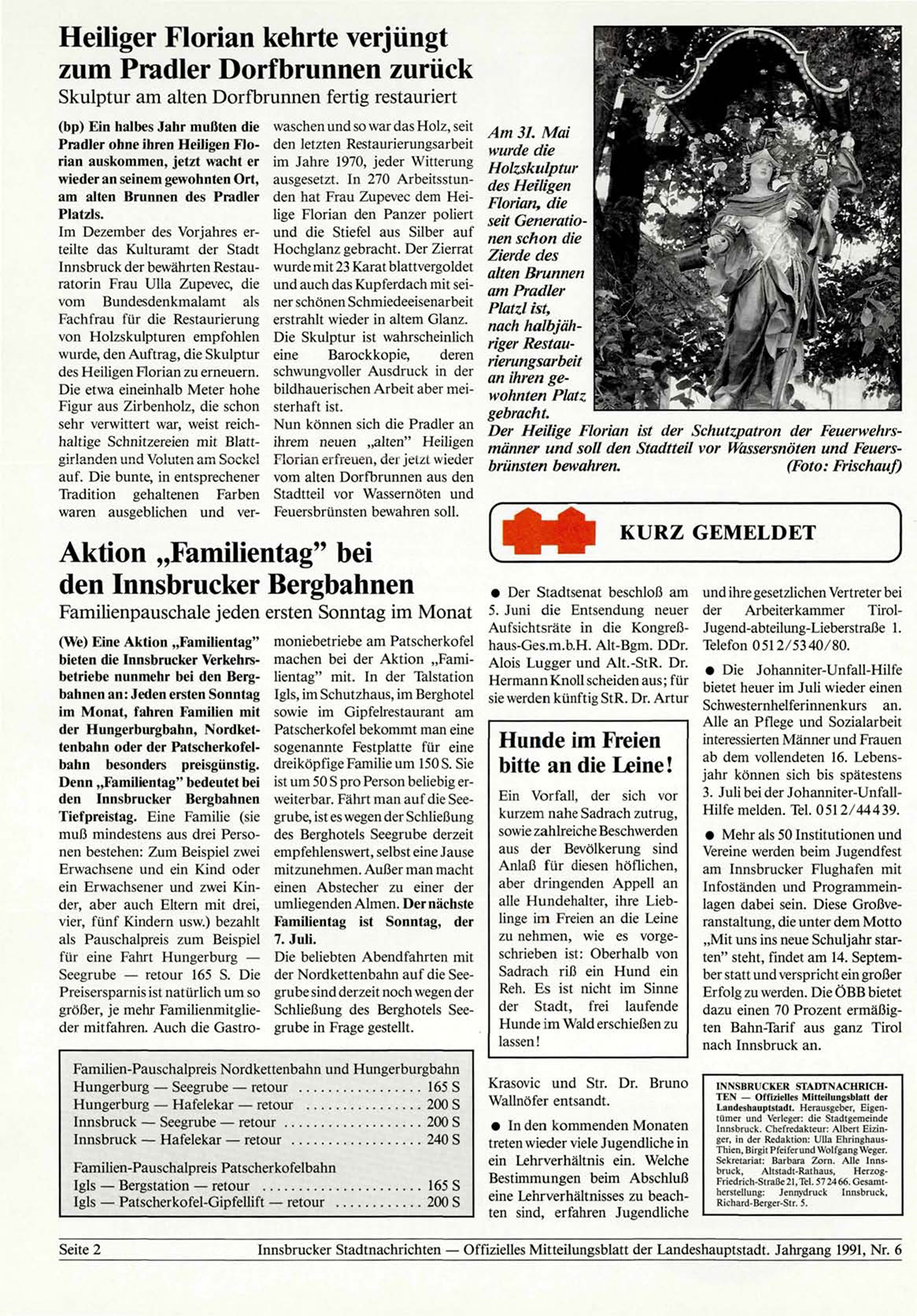 Innsbrucker Stadtnachrichten — Offizielles Mitteilungsblatt der Landeshauptstadt. Jahrgang 1991, Nr. 6