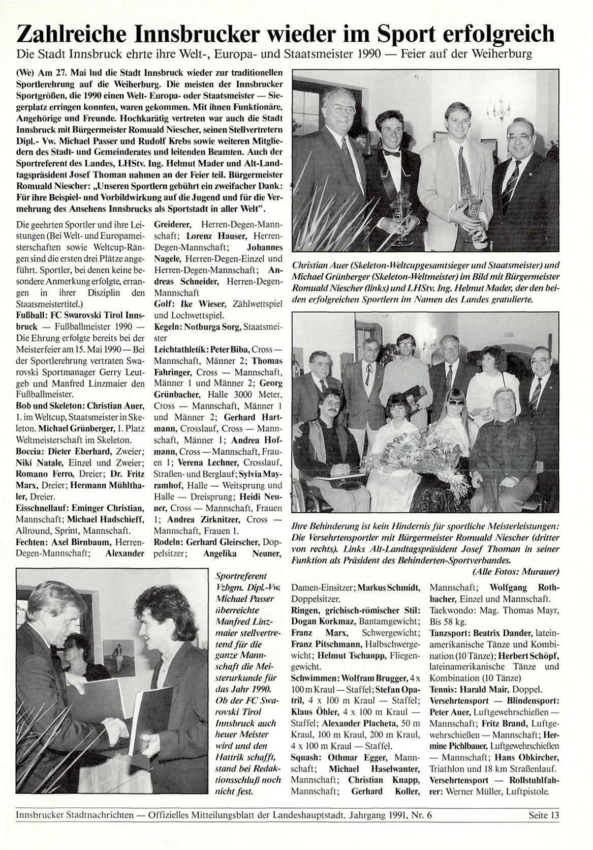 Die Stadt Innsbruck ehrte ihre Welt-, Europa- und Staatsmeister 1990 — Feier auf der Weiher bürg