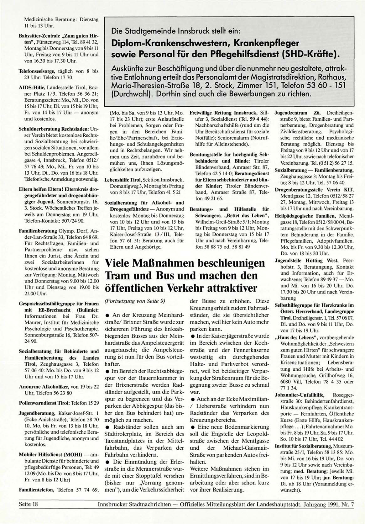 Innsbrucker Stadtnachrichten — Offizielles Mitteilungsblatt der Landeshauptstadt. Jahrgang 1991, Nr. 7