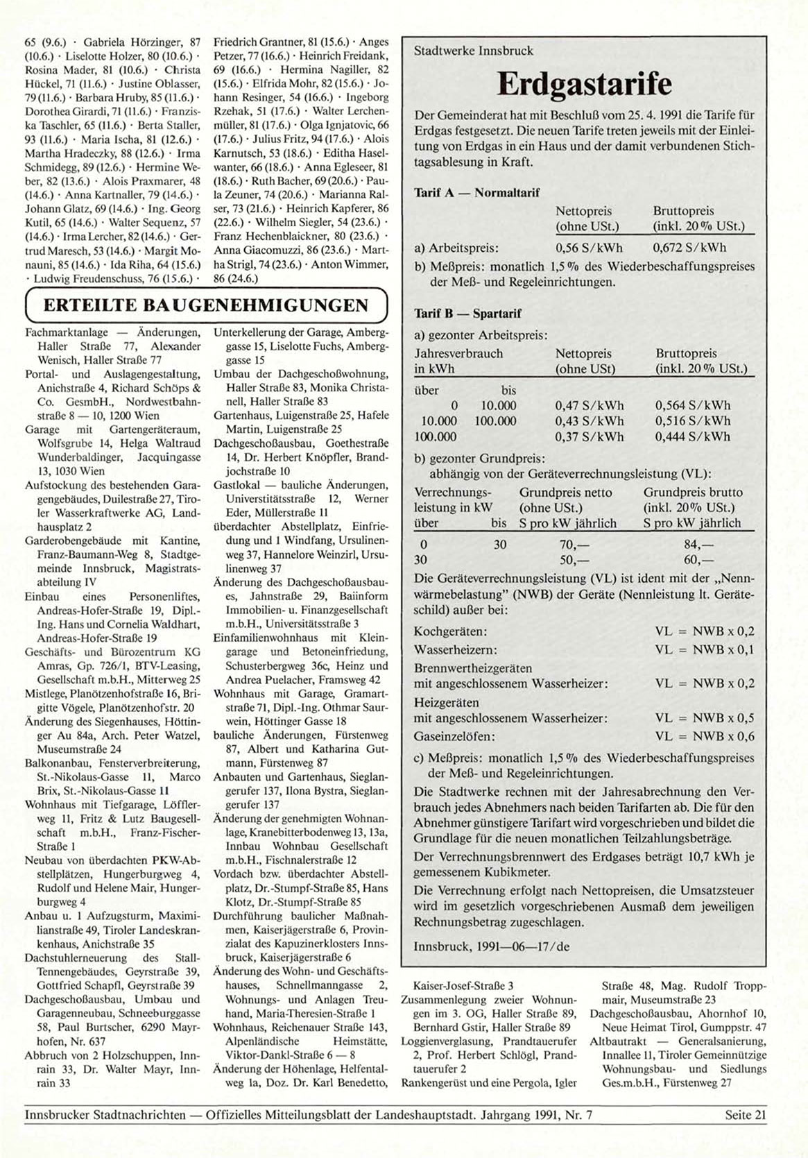 Innsbrucker Stadtnachrichten — Offizielles Mitteilungsblatt der Landeshauptstadt. Jahrgang 1991, Nr. 7