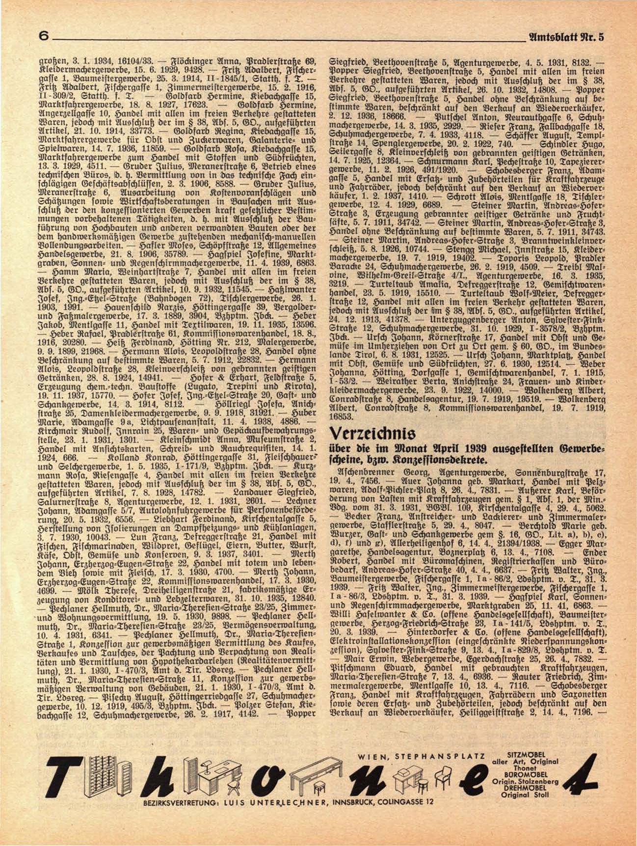 — Steiner Martin, Andreas-Hofer-Straße 3, Branntweinkleinverschleiß. 5. 8. 1926. 10744. — Stengg Michael, Innstraße 15. Kleidermachergewerbe. 19. 7. 1919. 19402. — Toporis Leopold. Pradler