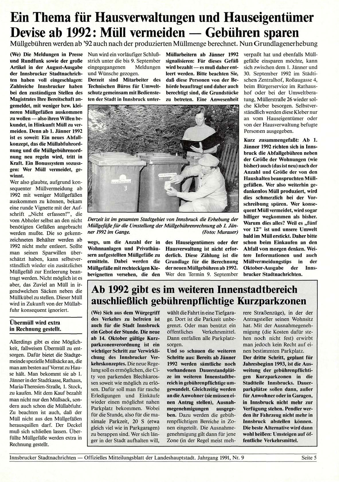 Innsbrucker Stadtnachrichten — Offizielles Mitteilungsblatt der Landeshauptstadt. Jahrgang 1991, Nr. 9