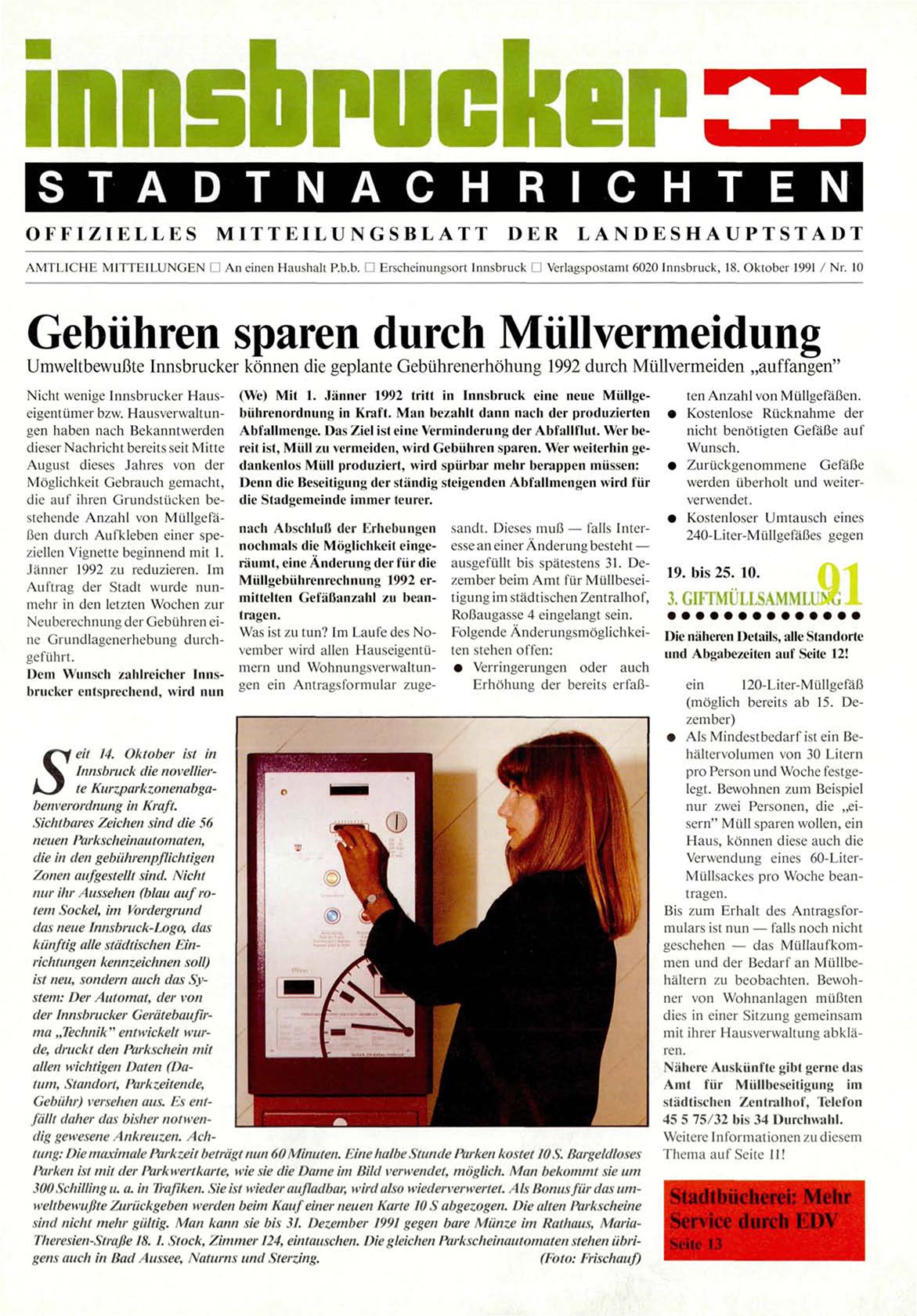 sind nicht mehr gültig. Man kann sie bis 31. Dezember 1991 gegen bare Münze im Rathaus, MariaTheresien-Straße 18. 1. Stock, Zimmer 124, eintauschen. Die gleichen Parkscheinautomaten stehen übrigens auch in Bad Aussee, Naturns und Sterzing.