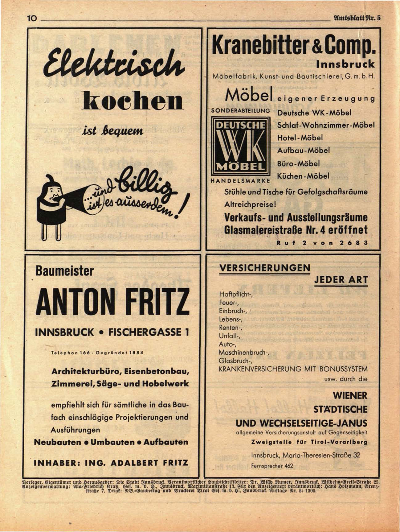 Perleger, Eigentümer und Herausgeber: Die Stadt Innsbruck. Verantwortlicher Hauptschriftleiter: Dr. Willy Rumer, Innsbruck, Wilhelm-Greil-Straße 25.