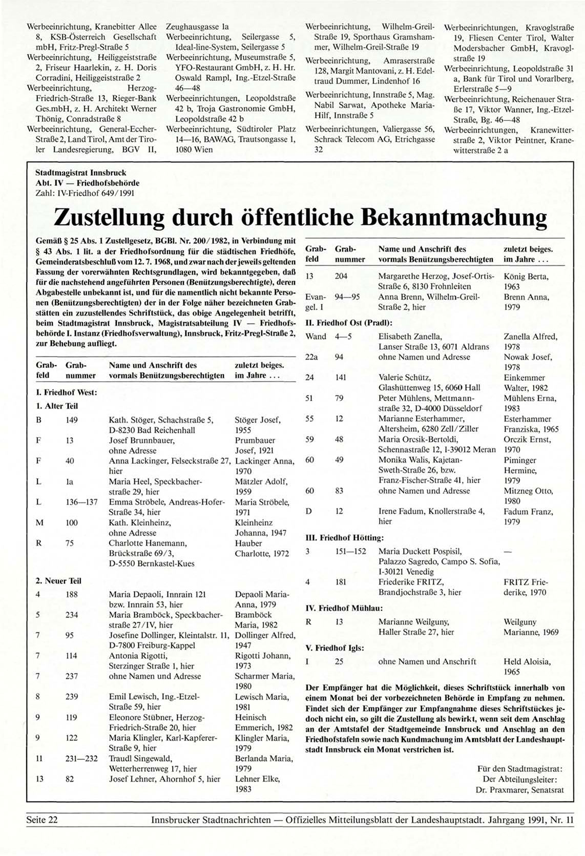 Friedhofstafeln sowie nach Kundmachung im Amtsblatt der Landeshauptstadt Innsbruck ein Monat verstrichen ist.