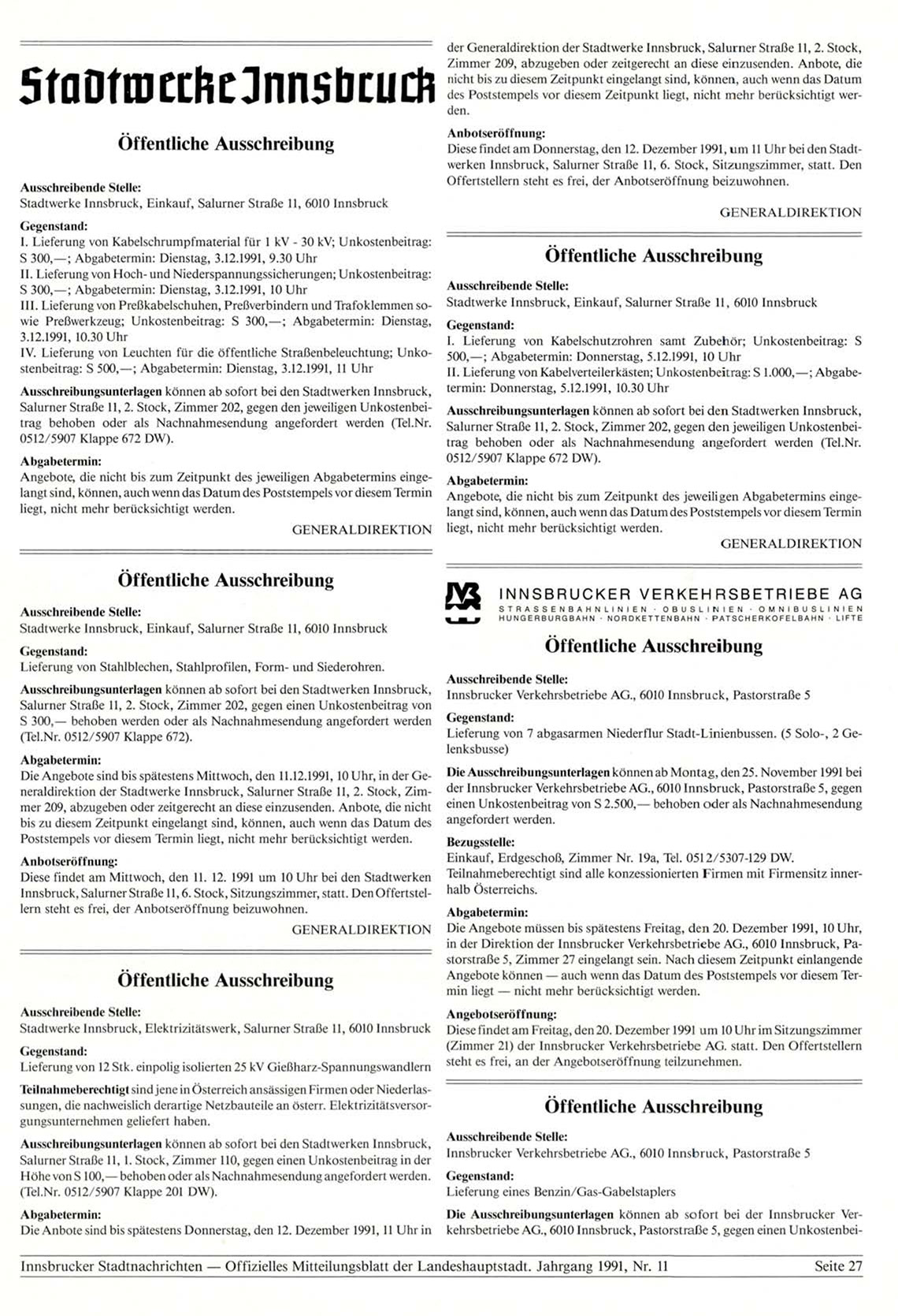 Die Angebote sind bis spätestens Mittwoch, den 11.12.1991, 10 Uhr, in der Generaldirektion der Stadtwerke Innsbruck, Salurner Straße 11, 2. Stock, Zimmer 209, abzugeben oder zeitgerecht an diese einzusenden. Anbote, die nicht