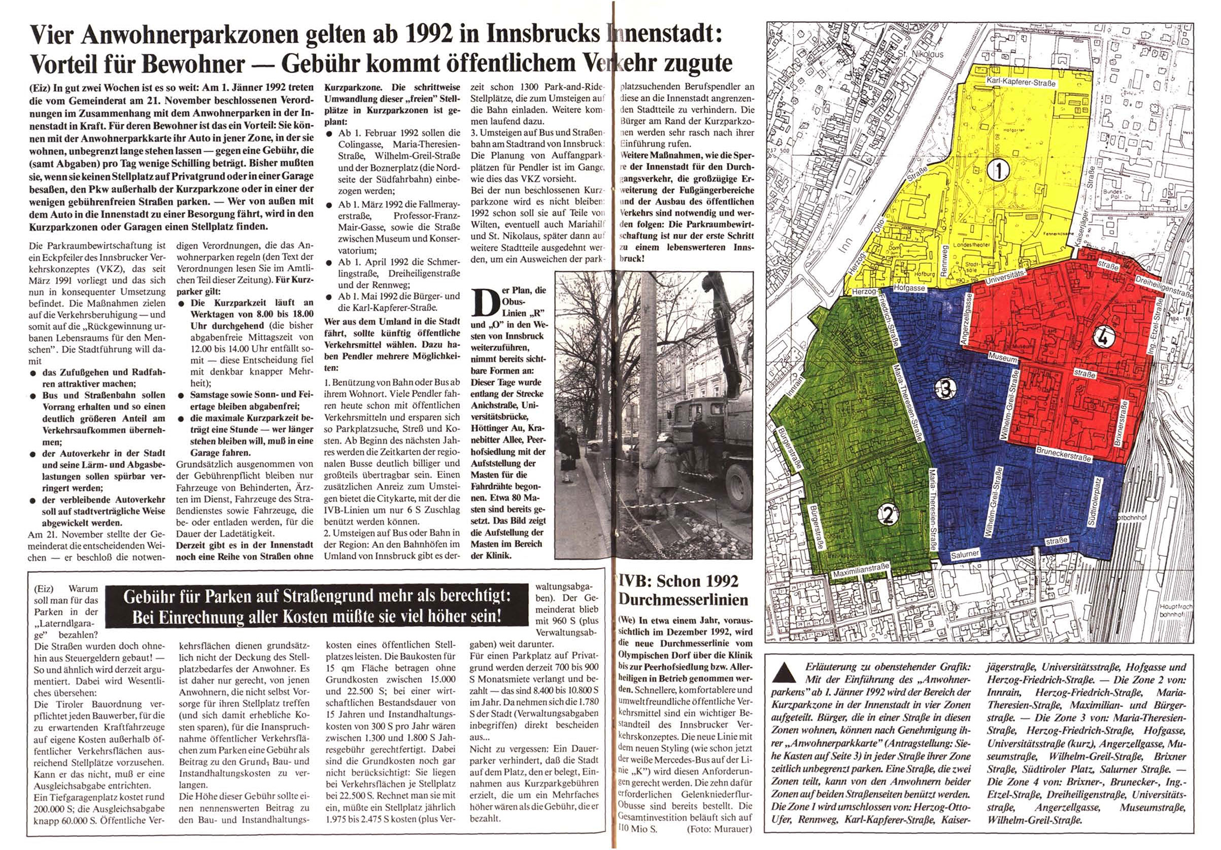 Vier Anwohnerparkzonen gelten ab 1992 in Innsbrucks Innenstadt: