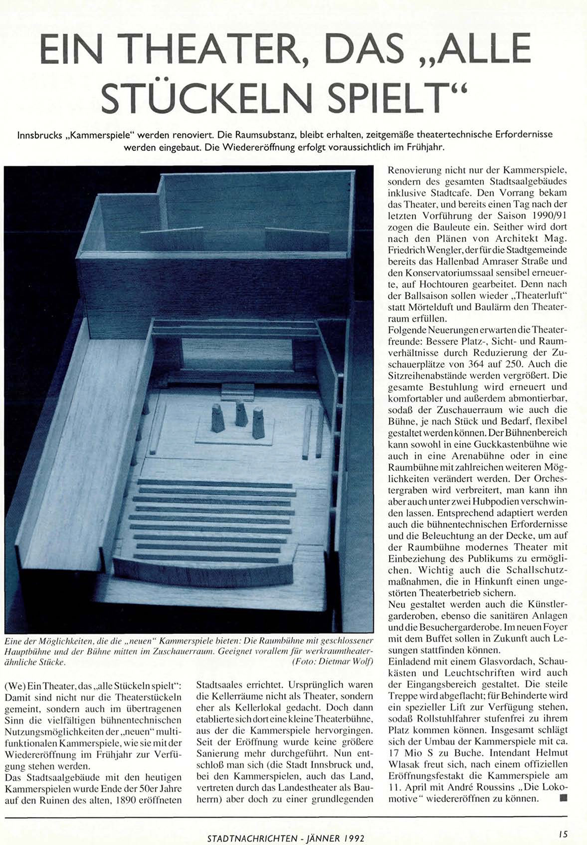 Innsbrucks „Kammerspiele" werden renoviert. Die Raumsubstanz, bleibt erhalten, zeitgemäße theatertechnische Erfordernisse