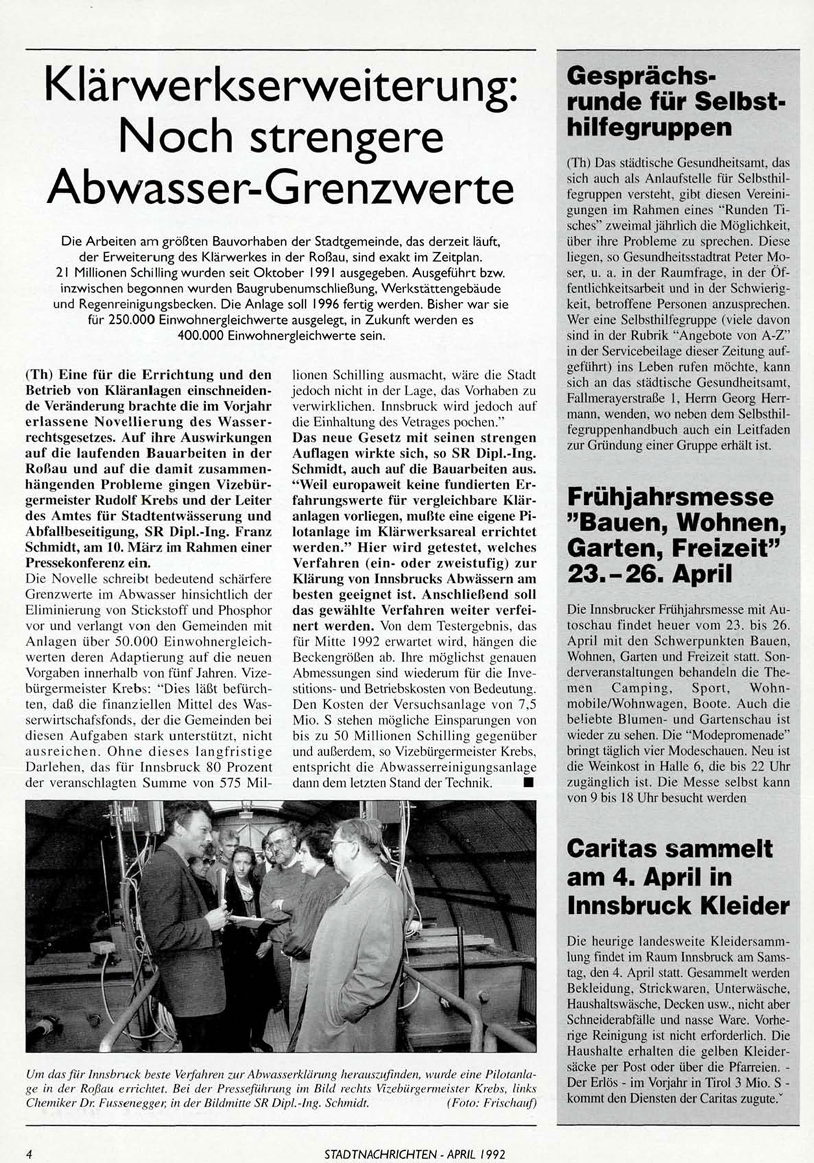 Um das für Innsbruck beste Verfahren zur Abwasserklärung herauszufinden, wurde eine Pilotanlage in der Roßau errichtet. Bei der Presseführung im Bild rechts Vizebürgermeister Krebs, links