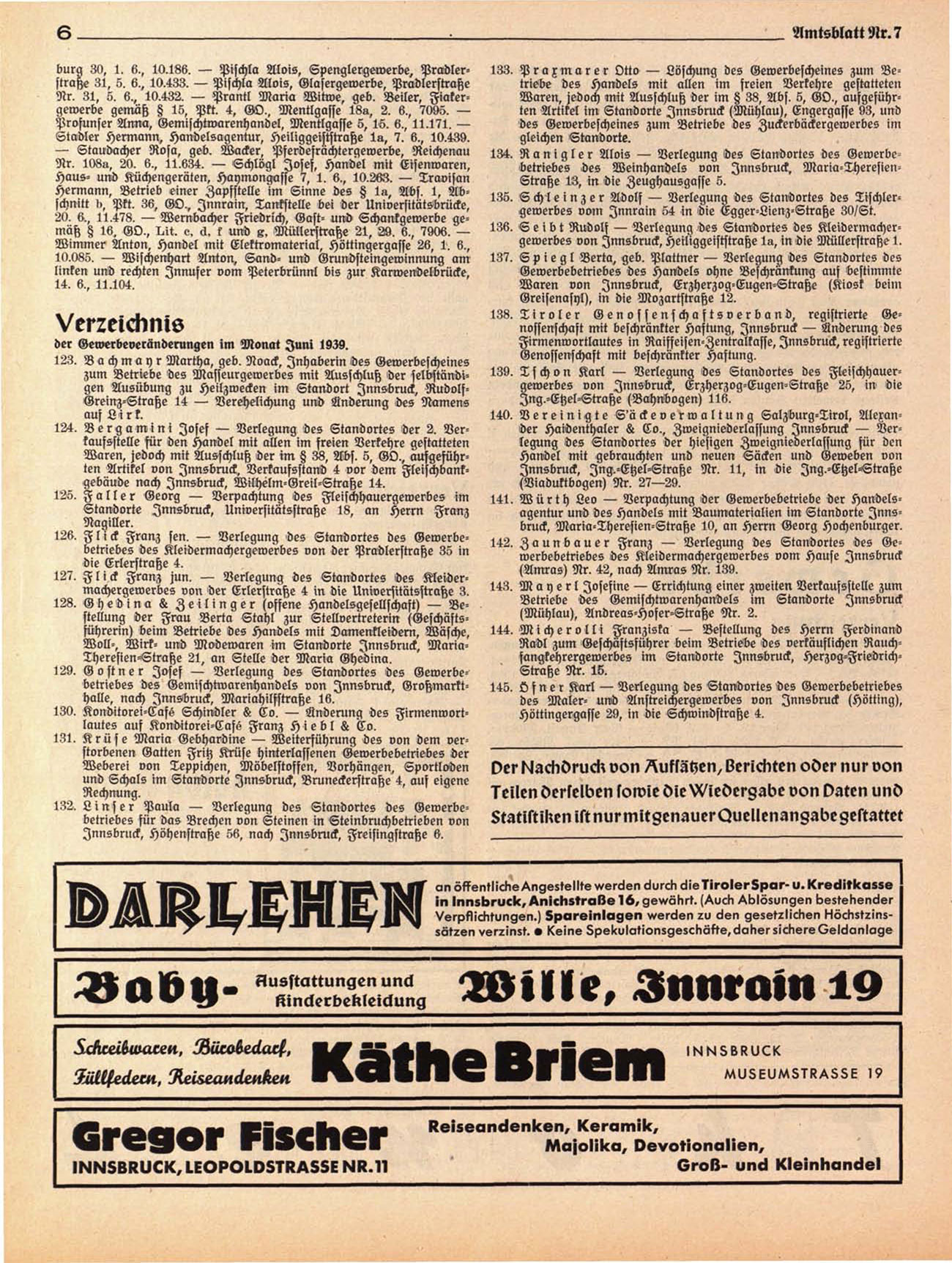 burg 30, 1. 6., 10.186. — Pischla Mois, Spenglergewerbe, Pradlerstrahe 31, 5. 6., 10.433. — Pischla Alois, Glafergewerbe, Pradlerstraße