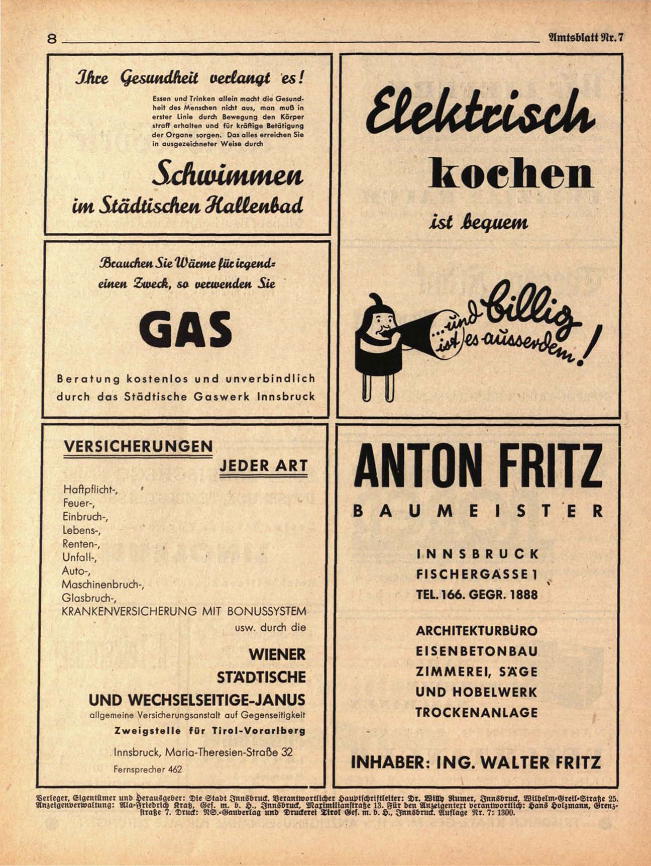 Verleger. Eigentümer und Herausgeber: Die Stadt Innsbrucl. Verantwortlicher Hauptschriftleiter: Dr. Willy Rum«, Innsbruck. WUHelm-Greil"Strahe 25.