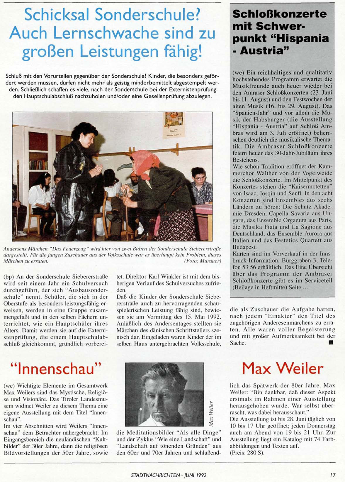 Daß die Kinder der Sonderschule Siebererstraße auch zu hervorragenden schauspielerischen Leistung fähig sind, bewiesen sie am Vormittag des 15. Mai 1992.