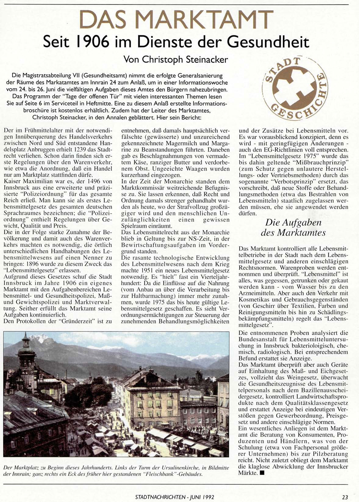 Marktamt mit den Aufgabenbereichen Lebensmittel- und Gesundheitspolizei, Maßund Gewichtspolizei und Marktverwaltung. Seither erfüllt das Marktamt seine