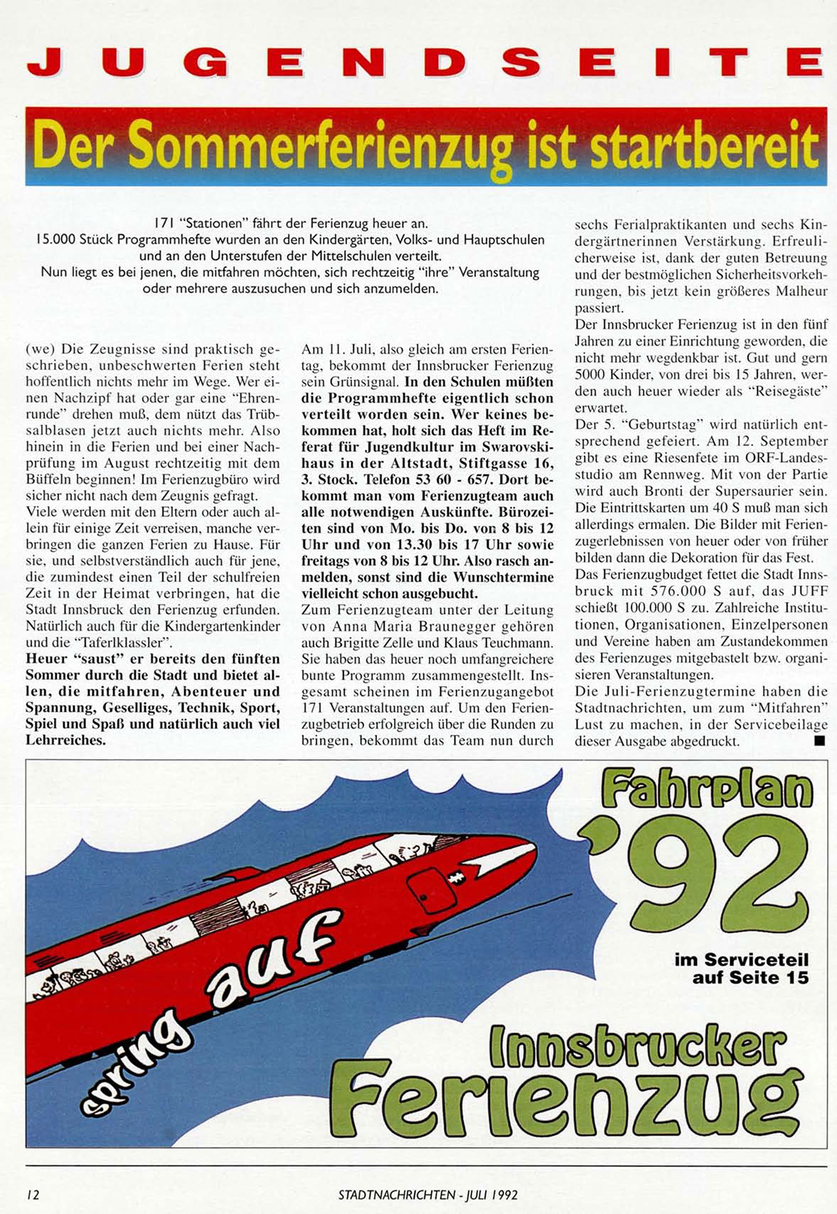 Das Ferienzugbudget fettet die Stadt Innsbruck mit 576.000 S auf, das JUFF