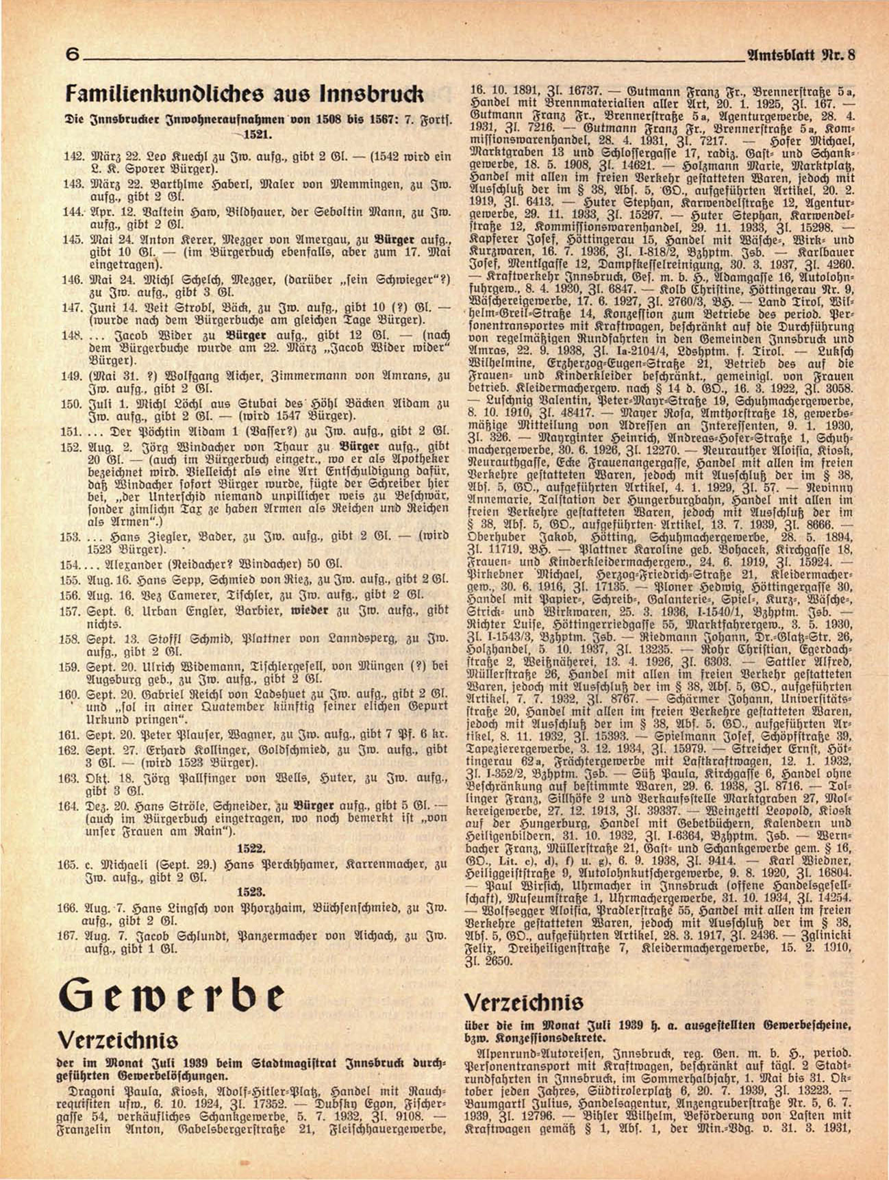 der im Monat Juli 1939 beim Ttadtmagistrat Innsbruck durchgeführten Gewerbelöschungen.