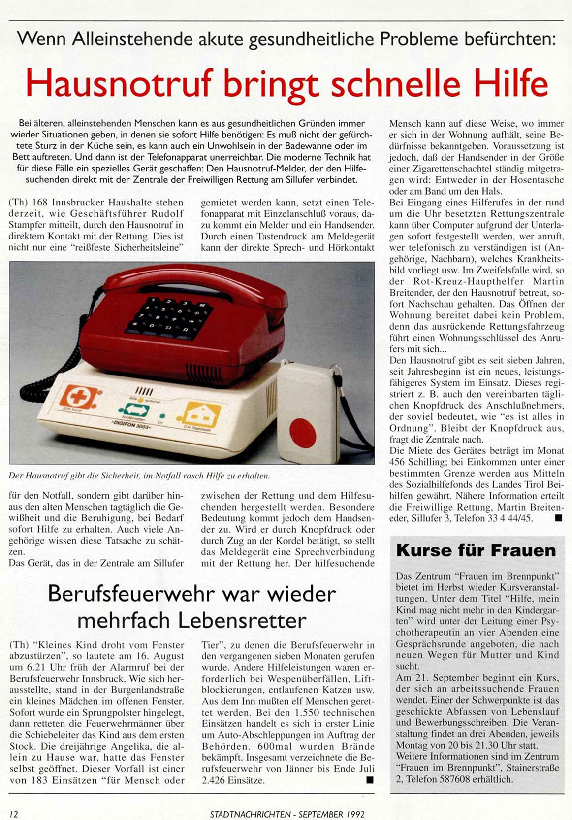 für diese Fälle ein spezielles Gerät geschaffen: Den Hausnotruf-Melder, der den Hilfesuchenden direkt mit der Zentrale der Freiwilligen Rettung am Sillufer verbindet.