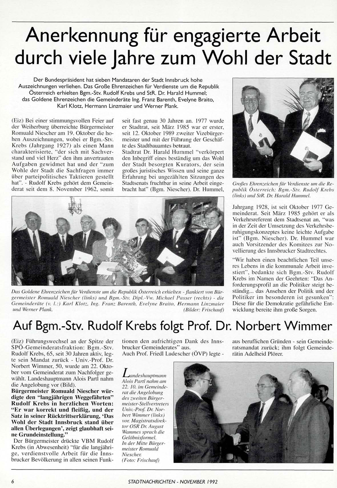 Krebs (in Abwesenheit) "für die langjährige, verdienstvolle Arbeit für die Innsbrucker Bevölkerung in allen seinen Funk-