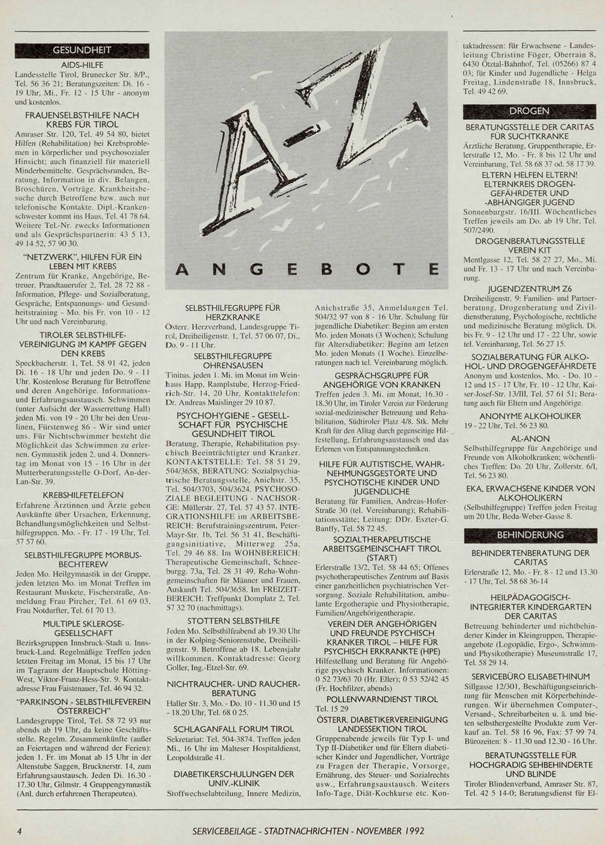 Tel. 504/3703, 504/3624. PSYCHOSOZIALE BEGLEITUNG - NACHSORGE: Müllerstr. 27, Tel. 57 43 57. INTEGRATIONSHILFE im ARBEITSBEREICH: Berufstrainingszentrum, PeterMayr-Str. lb, Tel. 56 31 41, Beschäftigungsinitiative,
