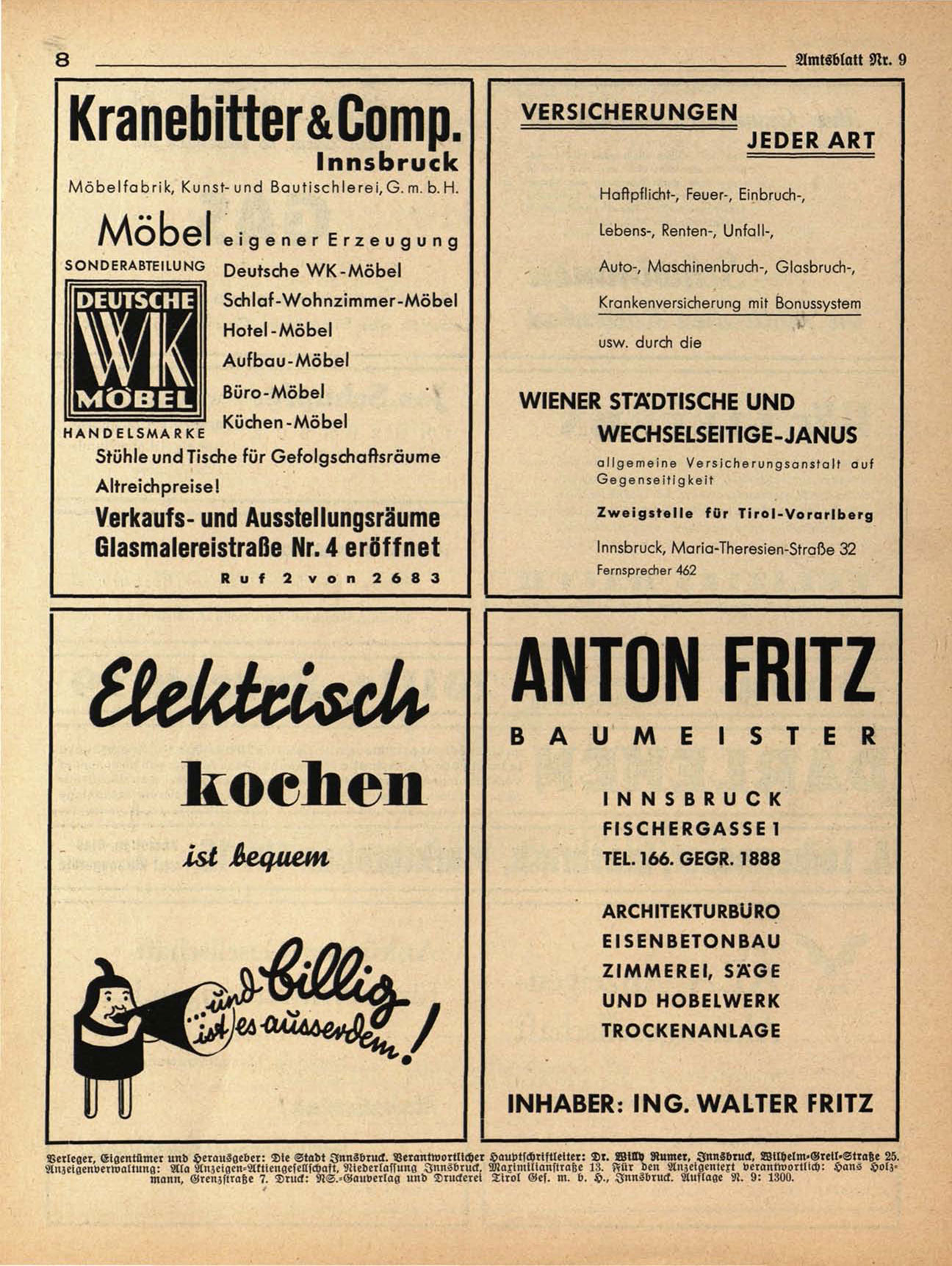 Anzeigenverwaltung: Ala Anzeiaen-Attienaefellschaft. Niederlassung Innsbruck. Maximilianstraße 13. M r den Anzeigentext verantwortlich: Hans Holzmann, Grenzstiaße 7. Druck: NS.-Gauverlag und Druckerei Tirol Ges. m. b. H., Innsbruck. Auflage N. 9: 130U.